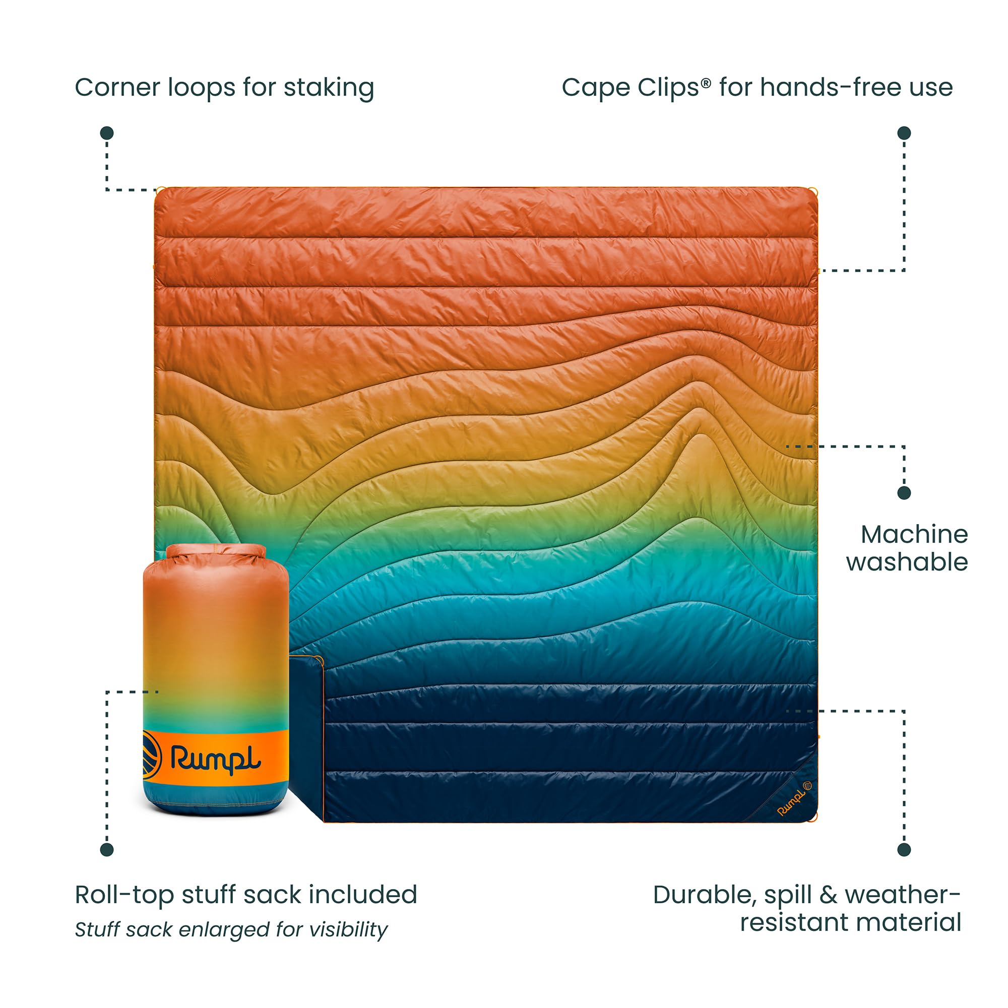 Boah, ist die kuschelig! Die Rumpl Puffy Decke ist dein neuer bester Freund für alle Outdoor-Abenteuer. Mit 203x213 cm ist sie groß genug für zwei Personen und hält dich richtig warm - dank der Isolierung aus 100% recyceltem Polyester. Das coole Pyro Fade Design sieht nicht nur mega aus, sondern die Decke ist auch noch wasserabweisend und weist Schmutz, Sand und Tierhaare ab. Perfekt für Camping, Picknicks, Strandtage oder einfach fürs gemütliche Lagerfeuer. Wenn du unterwegs bist, packst du sie einfach in die praktische Tragetasche zusammen - von 203 cm auf nur 20 cm! Mit den Cape-Clips kannst du sie dir sogar um die Schultern hängen und hast die Hände frei. Und das Beste: Jede Decke wird aus etwa 60 Plastikflaschen hergestellt. Also, warm bleiben und dabei noch was Gutes für die Umwelt tun - win-win!