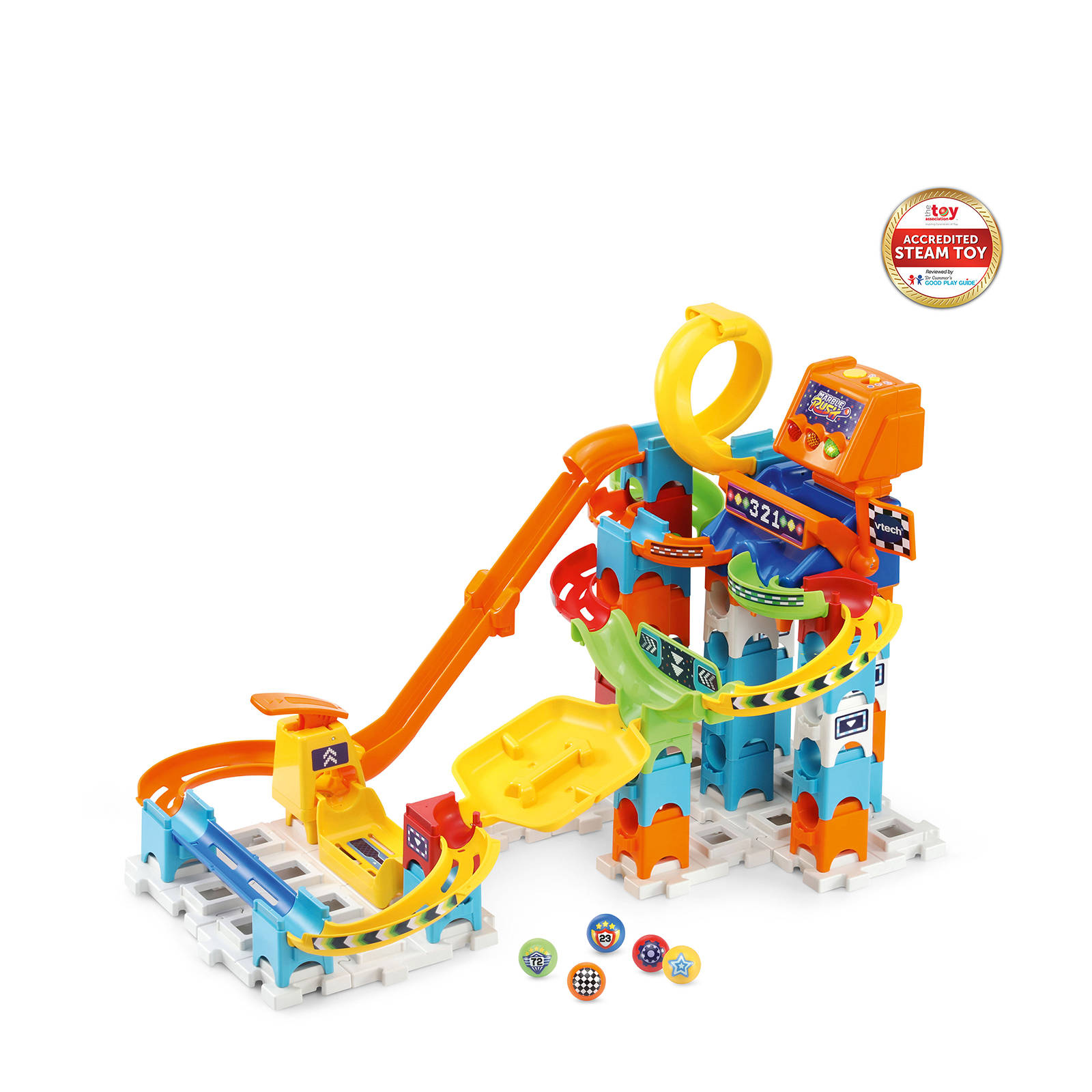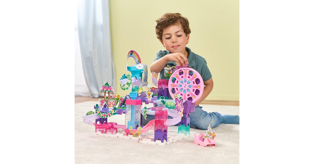 Ab ins Feenland voller Magie! Diese Vtech Marble Rush Kugelbahn lässt Kinderträume wahr werden. Mit 96 Bauteilen, 6 glitzernden MarBalls und 29 Dekoelementen wie Wasserfall, Zauberaufzug und drehender Blume. Das Highlight: das motorisierte Riesenrad, das die Kugeln automatisch auf die nächste Ebene befördert! 16 Filzdekorationen verwandeln die Bahn in einen märchenhaften Garten - als Aufsatz oder zwischen den Elementen. Unendliche Aufbaumöglichkeiten mit Kurven, Tunneln und Rampen fördern motorische Fähigkeiten, Kreativität und räumliches Denken. Inklusive farbiger Anleitung mit verschiedenen Schwierigkeitsstufen. Kompatibel mit allen Marble Rush Sets für riesige Kugelbahnwelten. Mit kindersicherem Batteriefach und Abschaltautomatik. Perfekt für kleine Baumeister ab 4 Jahren!