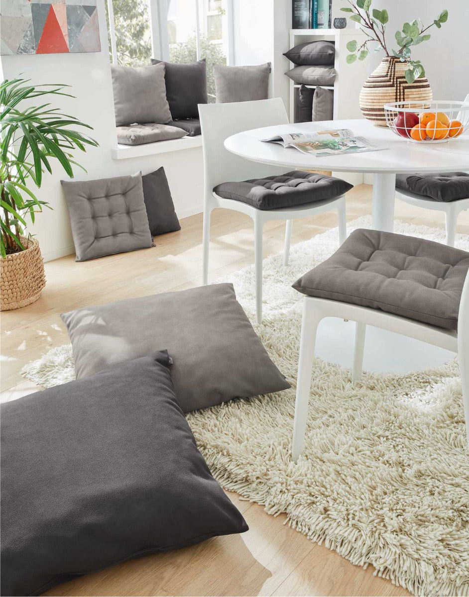 Du kannst die Kissen einzeln oder im Set kaufen - je nachdem wie viele du brauchst. Die dunkelgraue Farbe ist total praktisch, weil sie nicht so schnell schmutzig aussieht. Und falls doch mal was draufkommt: einfach abwischen oder in der Maschine waschen.