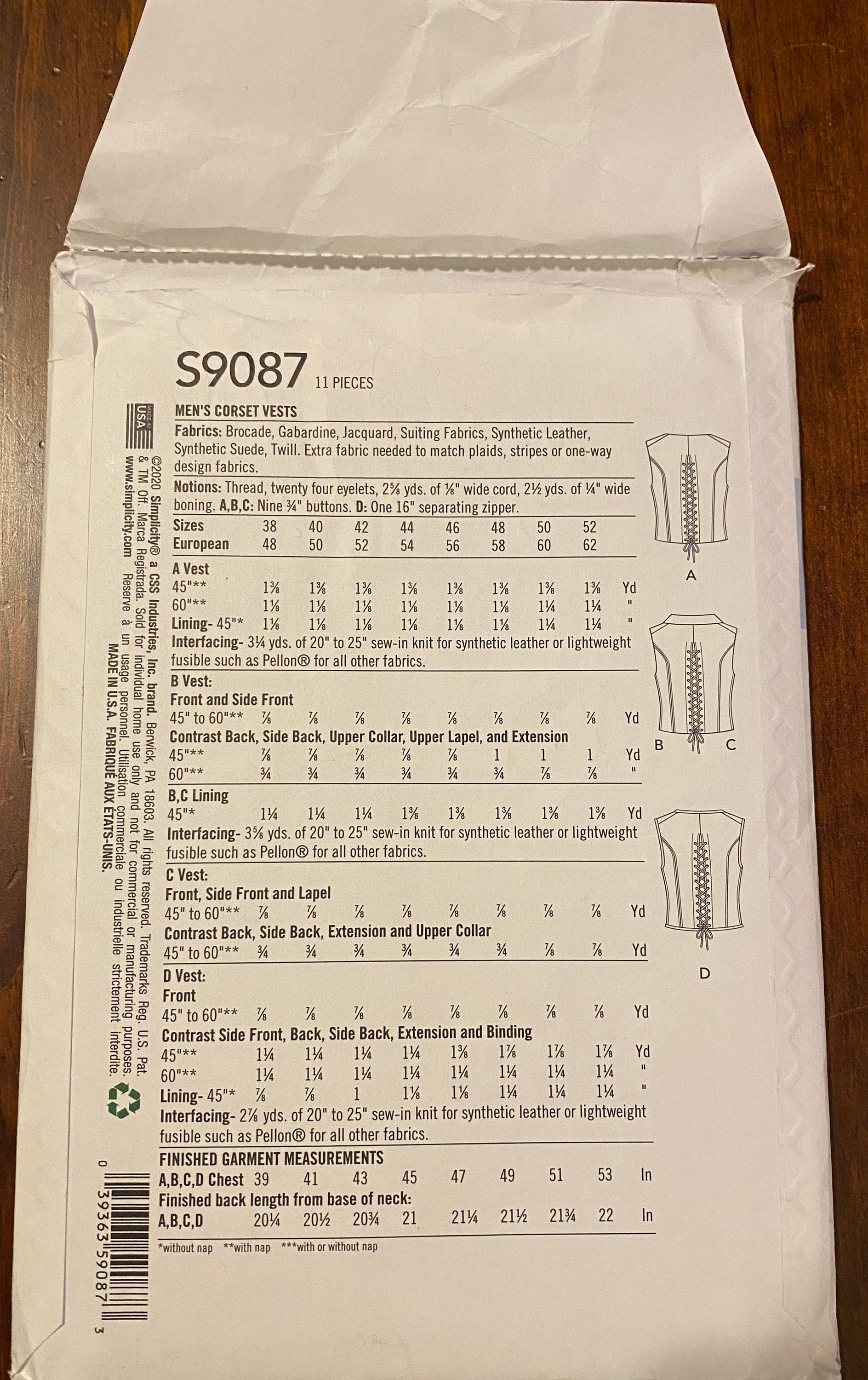 Simplicity Schnittmuster S9087 - Steampunk Korsettwesten Für Herren In Größe 46-52