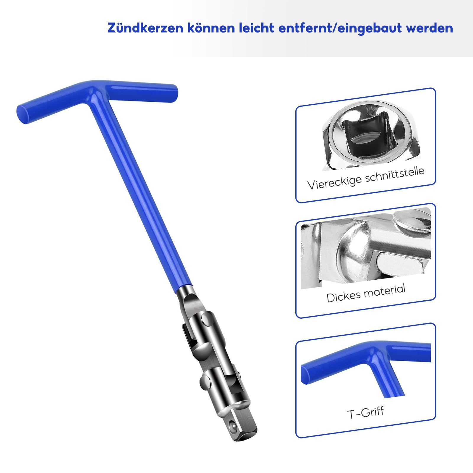 Perfektes Werkzeug für Zündkerzen-Wechsel! Dieses 4-teilige Set hat alles, was du brauchst: Einen T-Griff mit flexiblem Gelenk für enge Motorräume und drei Nüsse in 16mm, 18mm und 21mm. Aus robustem Kohlenstoffstahl gefertigt und verchromt gegen Rost. Der flexible Kopf macht auch unmöglich erscheinende Zündkerzen zugänglich. Perfekt für Auto, Motorrad, Rasenmäher und mehr. Liegt gut in der Hand und gibt sicheren Halt. Ein Muss für jede Werkstatt - ob Profi oder Hobby-Schrauber. Einfach das richtige Maul wählen und die Zündkerze wechseln - so einfach war's noch nie!