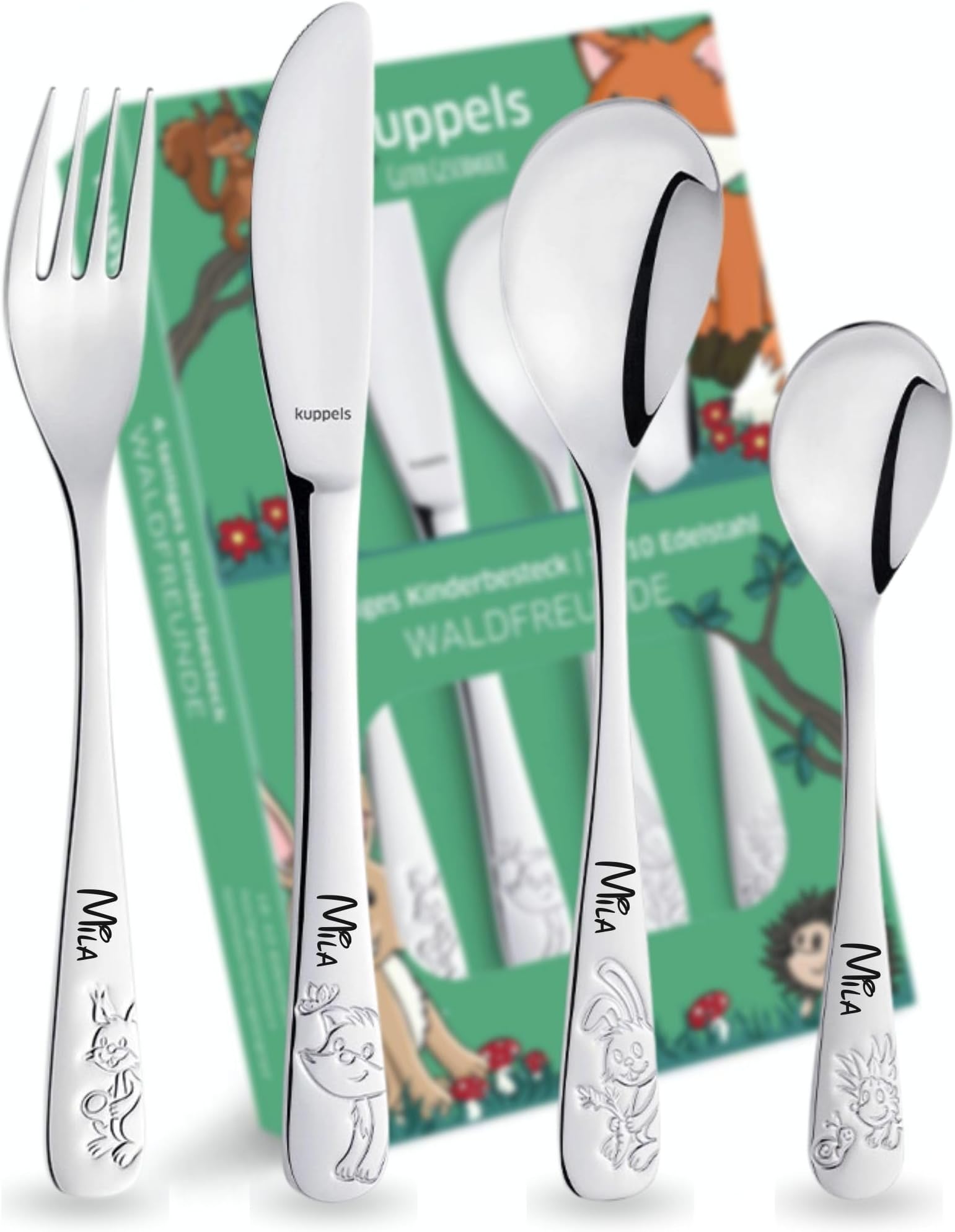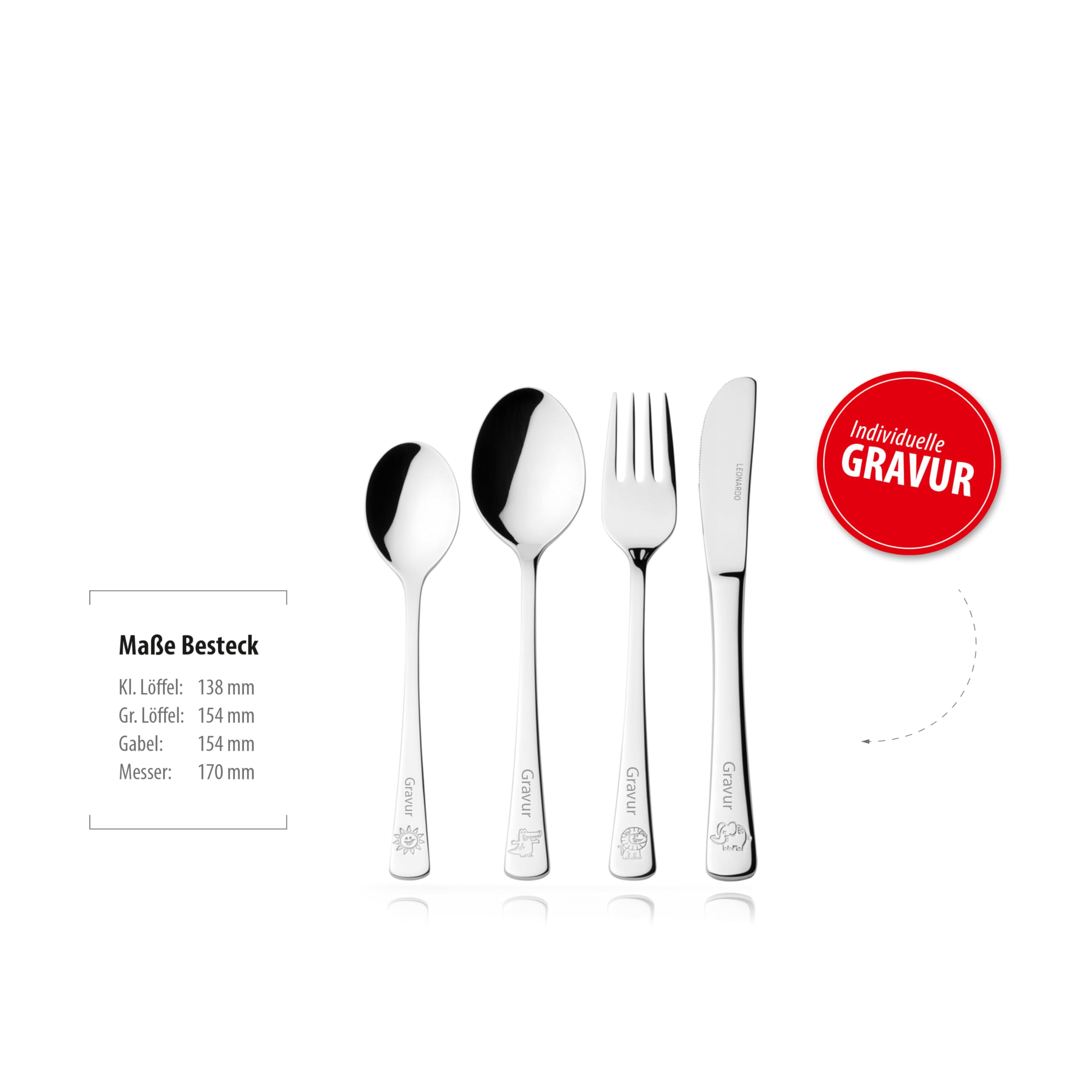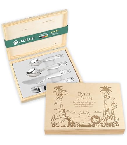 So macht Essen Spaß! Dieses entzückende 4-teilige Kinderbesteck mit Safari-Motiven (Kuh, Zebra, Giraffe) lässt Kinderaugen strahlen. Noch persönlicher wird's mit einer Gravur - einfach Namen oder Text eingeben und das Besteck wird individuell für dein Kind personalisiert! Perfekt für den täglichen Gebrauch oder als besonderes Geschenk zum Geburtstag. Hochwertige Verarbeitung und kindgerechte Größe. Mit der Live-Vorschau siehst du sofort, wie dein personalisiertes Besteck aussehen wird. Mach die Mahlzeiten deines Kindes zu etwas Besonderem - bestell jetzt das einzigartige Safari-Besteck!