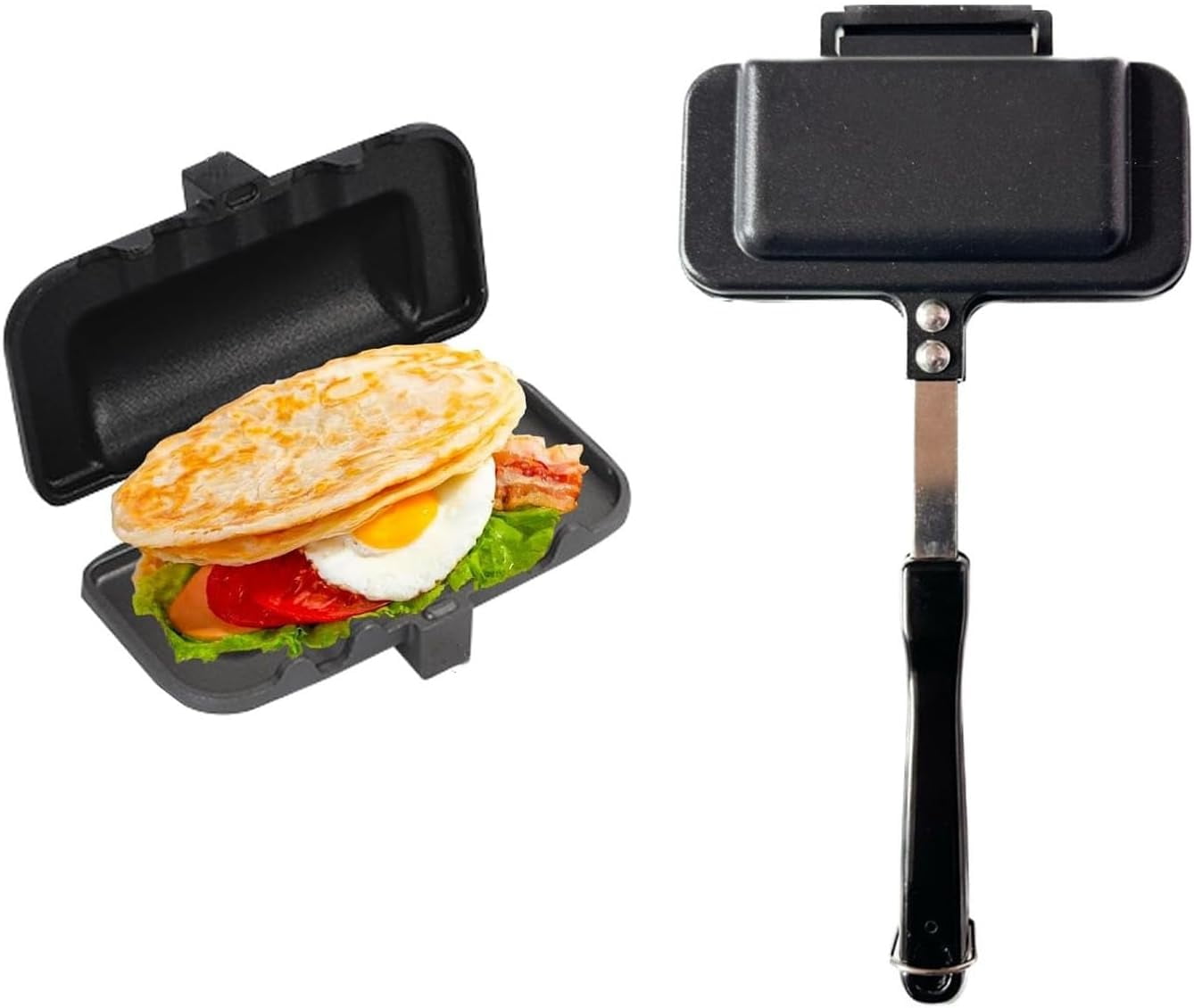 Boah, dieser Sandwich Maker ist ja mega praktisch! Doppelseitig grillen, sodass Dein Sandwich von beiden Seiten perfekt knusprig wird. Mit abnehmbarem Griff - super einfach zu reinigen. Aus Aluminiumlegierung mit Antihaftbeschichtung, nichts brennt an. Perfekt für Panini, Grillkäse, Eier oder French Toast. Nur 2-5 Minuten und fertig - ideal für stressige Morgen! Auch toll für Camping oder Picknick. Leicht (696g) und kompakt. Einfach auf jeden Herd stellen und los geht's!