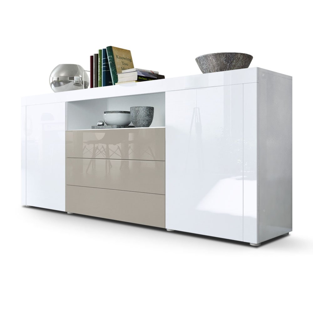 Das Vladon Sideboard Santiago bringt richtig Style in dein Wohnzimmer! In strahlendem Weiß Hochglanz sieht es einfach mega edel aus und ist dazu noch super praktisch. Mit drei Schubladen und zwei Türen hast du jede Menge Stauraum für deine Sachen. Besonders clever: Das offene Fach oben - perfekt für deine Spielekonsole, den Receiver oder andere Elektronik. Das Push-to-Open-System ist der Hit - einfach leicht drücken und schon öffnen sich Türen und Schubladen ohne Griffe. So bleibt das Design schön clean und modern. Hergestellt aus hochwertigem MDF-Material in Deutschland, ist das Sideboard richtig stabil und langlebig. Die Teleskopschienen aus Metall sorgen dafür, dass die Schubladen butterweich laufen. Der Aufbau ist dank der bebilderten Anleitung echt easy. Maße: 167cm breit, 72cm hoch und 35cm tief - passt perfekt in fast jedes Wohnzimmer. Ein echter Hingucker, der nicht nur gut aussieht, sondern auch super funktional ist!