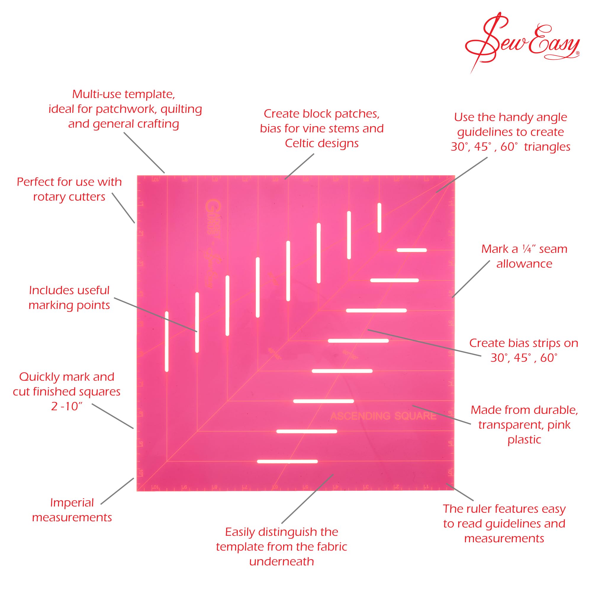 Quilt-Begeisterte, hier kommt euer neues Lieblingswerkzeug! Die Sew Easy quadratische Schablone (25x25 cm) macht Präzisionsarbeit zum Kinderspiel. Aus transparentem Acryl - siehst genau, was du tust. Rutschfeste Oberfläche - verrutscht nicht beim Schneiden. Perfekt für Block-Patches, keltische Muster oder Schrägband-Zuschnitte. Mit diesem cleveren Lineal kannst du verschiedene Dreiecksformen und gerade Schnitte mühelos hinbekommen. Spart so viel Zeit und Nerven beim Messen! Für Anfänger und Profis gleichermaßen geeignet. Macht aus jedem Quilt-Projekt ein Meisterwerk. Egal ob Steppdecke, Wandbehang oder Kissen - mit dieser Schablone wird alles gleichmäßig und professionell. Deine kreativen Möglichkeiten sind endlos - lass dich inspirieren!