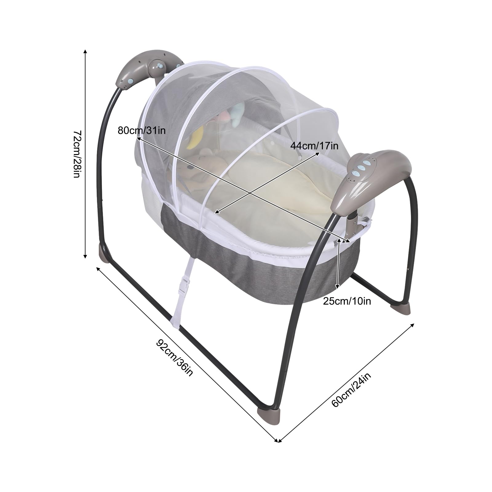 Mama, Papa - endlich mal die Hände frei! Diese elektrische Babyschaukel ist der absolute Lebensretter für junge Eltern. Einfach Baby rein, einschalten und schon schaukelt es sanft in den Schlaf.\n\nMit Fernbedienung kannst du aus 5 Stufen die Schaukel-Intensität wählen und Timer auf 8, 15 oder 30 Minuten stellen. Die Musik beruhigt zusätzlich und das Moskitonetz schützt vor lästigen Mücken.\n\nDas kuschelige Kissen ist super weich und der 25° Neigungswinkel schützt die Wirbelsäule. Fühlt sich an wie in Mamas Armen! Bis 12 kg hält die stabile Aluminium-Konstruktion problemlos.\n\nOb im Wohnzimmer oder Schlafzimmer - diese Schaukel wird dein neues Lieblingsmöbel! Dein Baby schläft endlich friedlich ein und du hast Zeit für dich. Einfach per USB aufladen und los geht's.\n\nTrust me: Diese Anschaffung wirst du nicht bereuen! Einfach genial für alle, die mal wieder beide Hände brauchen wollen.