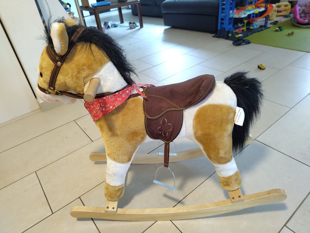 Das absolute Traum-Schaukelpferd für kleine Pferdefans! Der niedliche Haflinger von Happy People bringt Kinderaugen zum Strahlen. Mit vier verschiedenen echten Pferdegeräuschen fühlt sich das Reiten fast wie echt an. Bis zu 50 kg belastbar - da haben auch größere Kinder noch lange Freude dran. Der weiche Stoff lädt richtig zum Knuddeln ein und die hochwertige Verarbeitung sorgt für lange Haltbarkeit. Komplett mit Sattel und Trense sieht das Pferd total authentisch aus. Perfekt fürs Kinderzimmer, Wohnzimmer oder als Highlight im Spielzimmer. Das Schaukelpferd fördert den Gleichgewichtssinn und die Motorik - und macht dabei einfach riesigen Spaß. Ein klasse Geschenk zu Weihnachten, Geburtstag oder einfach so. Die sanfte Schaukelbewegung beruhigt und entspannt. Einfach aufstellen und schon kann der Ritt durch die Wildwest-Landschaft beginnen. Ob alleine oder mit Freunden - mit diesem Schaukelpferd wird jeder Tag zum Abenteuer. Ein zeitloser Klassiker der garantiert von Generation zu Generation weitergegeben wird!
