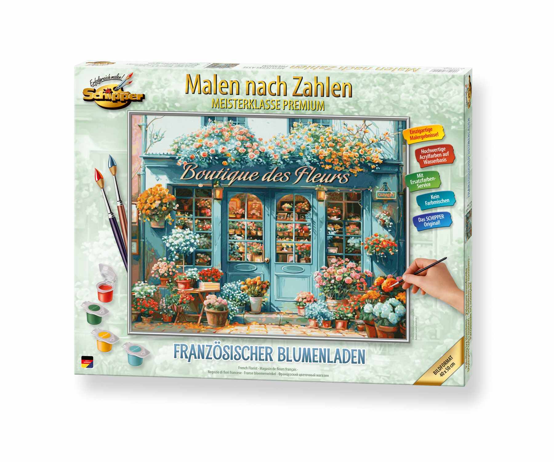 Hey, mal Lust was Kreatives zu machen? Mit diesem Schipper Malen nach Zahlen Set kannst du richtig easy ein tolles Bild malen - ganz ohne Vorkenntnisse! Das Motiv 'Französischer Blumenladen' bringt sofort Urlaubsflair in deine vier Wände. Im Set ist alles dabei: 36 Acrylfarben auf Wasserbasis, ein Pinsel, die Leinwand 40x50 cm und eine Anleitung. Die Leinwand hat diese coole Leinenstruktur, das sieht später aus wie ein echtes Ölgemälde! Perfekt für entspannende Abende oder als Geschenk. Deutsche Qualität von Schipper - da weißt du, was du kriegst. Einfach die Zahlen ausmalen und staunen, wie nach und nach ein richtiges Kunstwerk entsteht. Macht total Spaß und ist super entspannend!