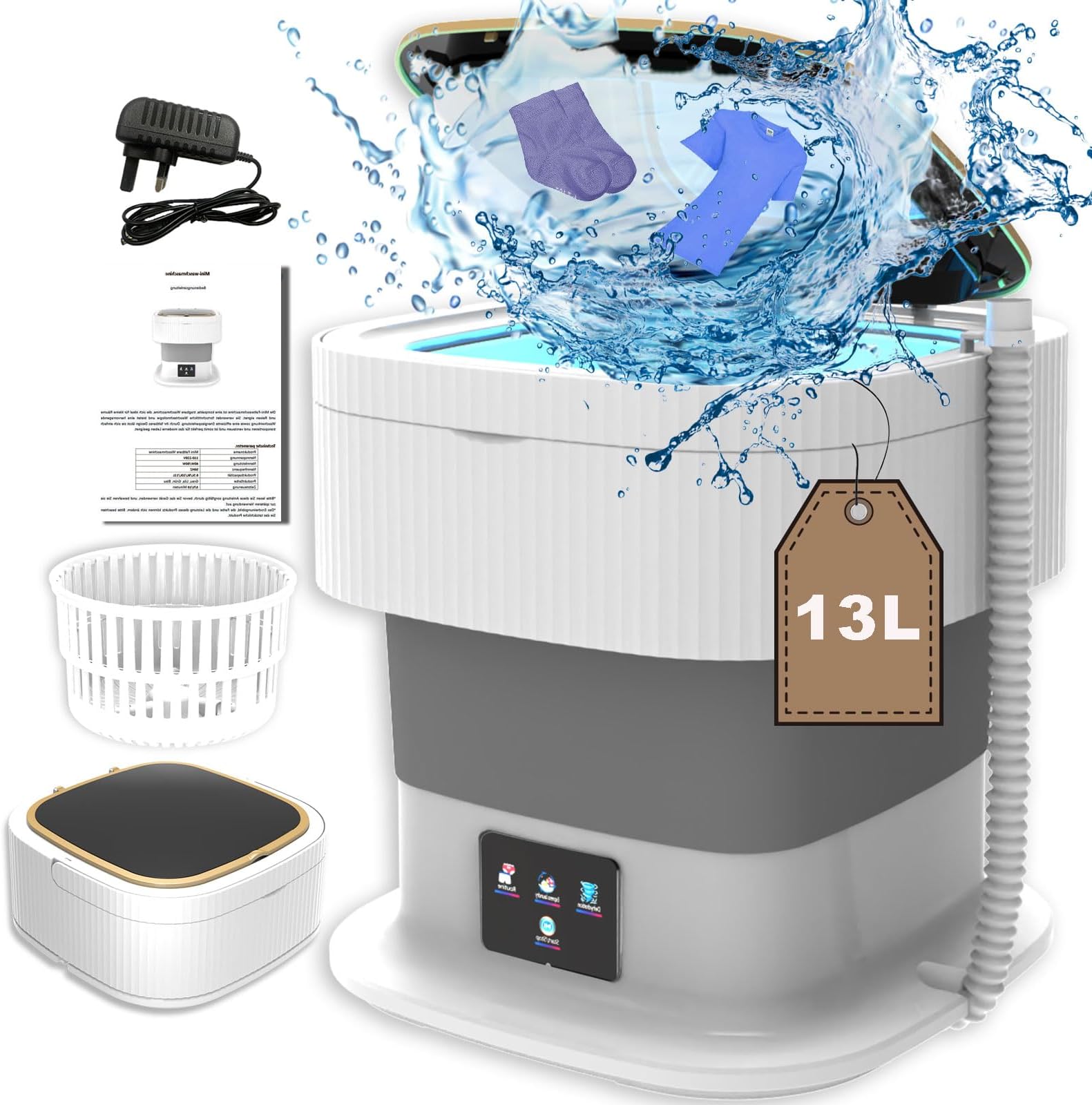 Boah, diese Mini-Waschmaschine ist ja mal total praktisch! Mit 11 Litern Fassungsvermögen wäscht sie perfekt kleine Sachen wie Unterwäsche, Socken, Handtücher oder Babykleidung. Bis zu sechs Socken auf einmal - ideal für Singles, Studenten oder Reisende! Das coole Feature: Sie kann waschen UND schleudern! Einfach den Korb rausnehmen oder reinmachen. Drei Programme stehen zur Auswahl: 10 Minuten Standard, 5 Minuten Schnellwäsche oder 2 Minuten Schleudern. Und das bei nur 45 dB - super leise also! Noch besser: Sie lässt sich zusammenklappen auf nur 29,5 x 29,5 x 14 cm - kaum größer als ein Schuhkarton! Mit nur 1,8 kg Gewicht und Tragegriff perfekt für Camping, Wohnheim oder Reisen. Aus hochwertigem ABS und TRP - rostfrei und langlebig. Energiesparend obendrein! Praktische Details: Transparenter Deckel zum Reingucken, vier Saugnäpfe für sicheren Stand, Ablaufschlauch zum Aufhängen und sogar drei faltbare Bügel inklusive! Die Blaulicht-Funktion sorgt für extra Hygiene. Einfach genial für alle, die nicht immer die große Maschine anwerfen wollen!