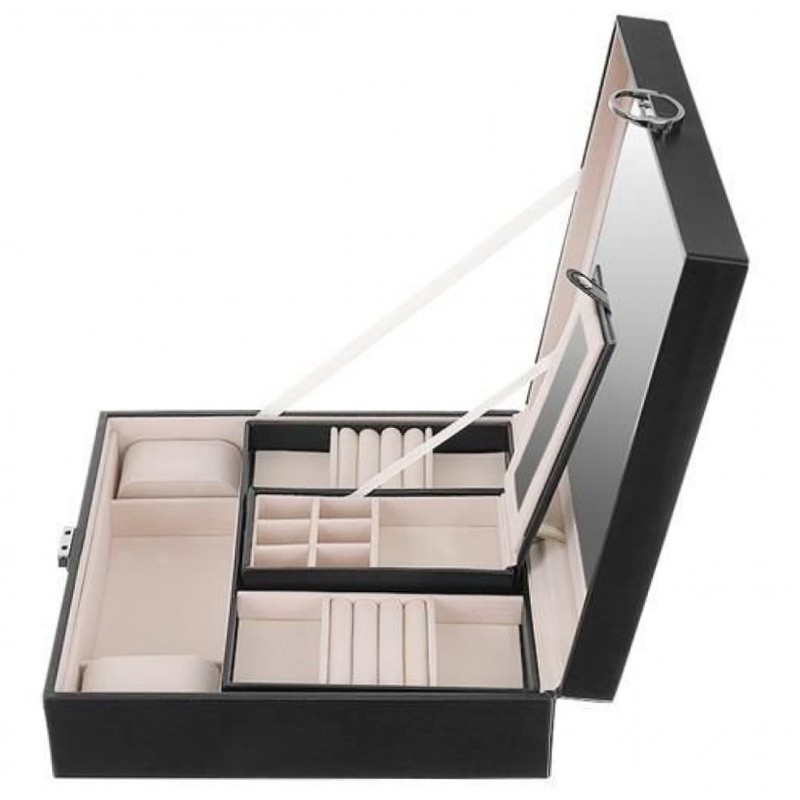 Suchst du eine kleine, feine Schmuckbox, die du auch mal mitnehmen kannst? Hier ist sie! Dieses schwarze Schmuckkästchen in der COMPACT Edition ist zwar klein, aber innen total clever aufgeteilt. An der Klappe innen kannst du deine Halsketten aufhängen, damit die sich nicht verknoten. Drin ist ein herausnehmbarer Ohrring-Halter - oder du nimmst den raus und hast dann ein großes Fach für Armbänder und anderes. Und ja, es hat ein Schloss! Mit nem kleinen Schlüssel, damit dein Schmuck auch unterwegs safe ist. Außen ist's aus Kunstleder, innen total weich mit Samt ausgelegt. Maße: 20,7 x 5,7 x 12,7 cm, wiegt nur 400 Gramm. Passt in jede Handtasche und sieht dazu noch richtig stylisch aus. Ob für die Reise oder einfach für zu Hause - dein Schmuck ist hier bestens aufgehoben und griffbereit, wenn du ihn brauchst.