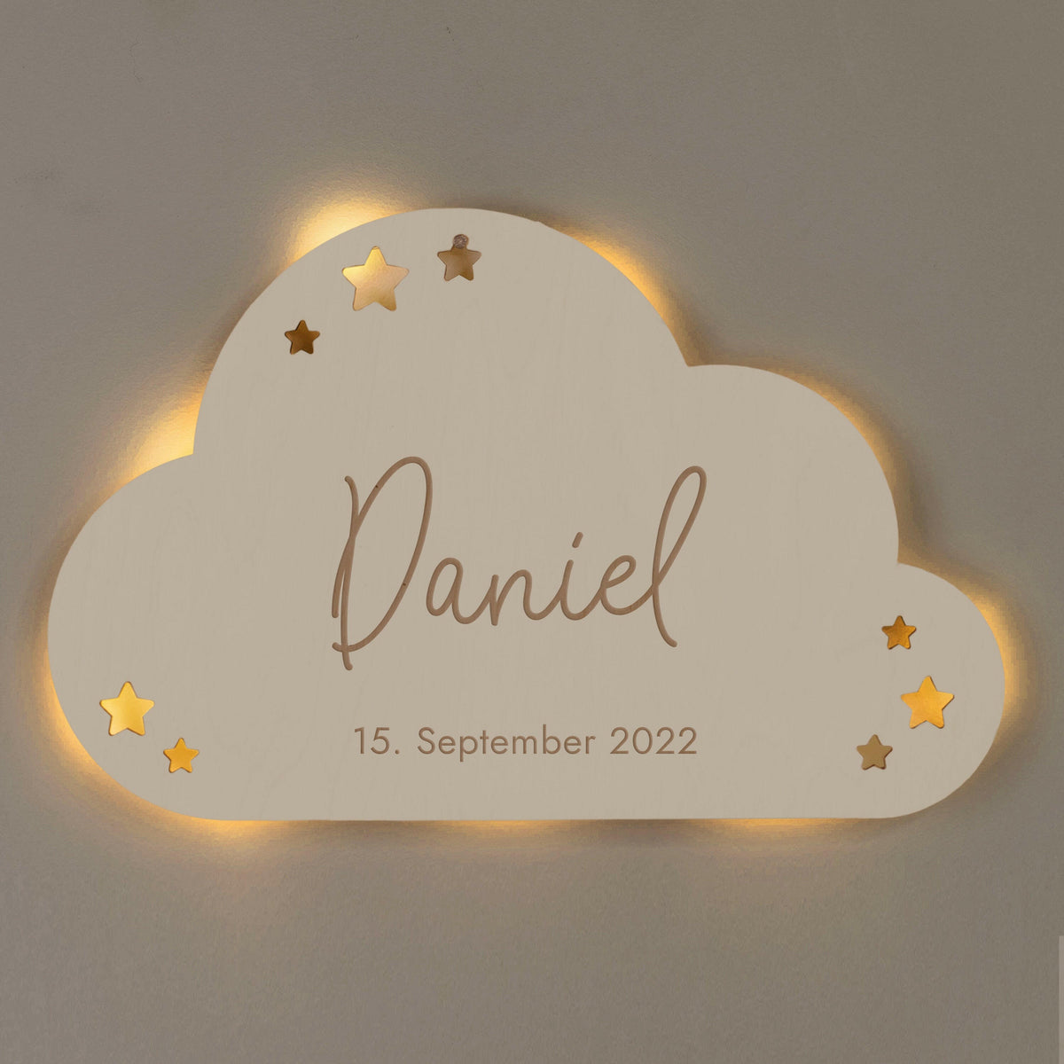Was gibt's Schöneres als auf Wolke Sieben zu schlummern? Dieses niedliche LED Schlummerlicht von LAUBLUST bringt genau dieses Gefühl ins Kinderzimmer! Das Besondere: Du kannst es mit dem Namen deines Kindes und dem Geburtsdatum personalisieren - ein wirklich einzigartiges Geschenk zur Geburt oder Taufe. Hergestellt wird das Nachtlicht aus Birkenholz in einer kleinen Manufaktur in Mönchengladbach, also total lokal! Auf der Rückseite sind viele kleine LED-Lämpchen fest angebracht, die für ein dezentes, indirektes Licht sorgen - perfekt zum Einschlafen. Der Kippschalter ist praktisch auf der Rückseite angebracht, genauso wie das Batteriefach. Du brauchst nur zwei AA-Batterien (nicht im Lieferumfang) und schon kann's losgehen. Mit den Maßen 35x22 cm ist das Schlummerlicht ideal fürs Kinderzimmer - ob an der Wand oder einfach hingestellt. Ein tolles Geschenk, das lange Freude macht und ganz sicher nicht von der Stange kommt!