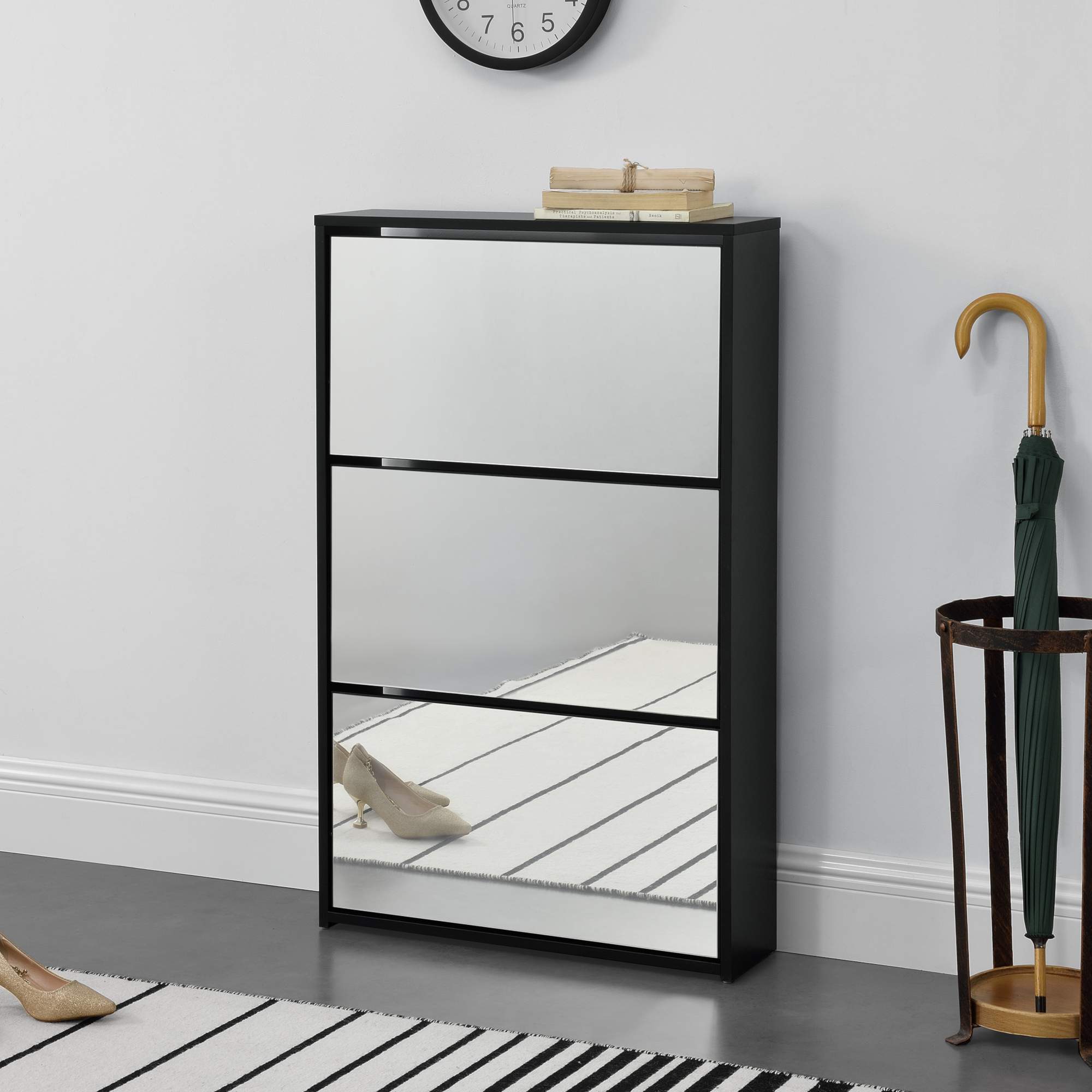 Oh man, endlich Ordnung im Flur! Dieser schmale Schuhschrank ist die Rettung für alle mit wenig Platz. Mit nur 24cm Breite passt er auch in die engste Diele und bietet trotzdem Platz für bis zu 6 Paar Schuhe. Die zwei Klappdeckel sind super praktisch - einfach aufmachen, Schuhe rein, zuklappen und schon sieht alles ordentlich aus. Oben drauf kannst du noch Deko, Pflanzen oder deine Schlüssel abstellen. Aus stabiler MDF-Platte gefertigt, steht der Schrank sicher und kippt nicht um. Die verstellbaren Einlegeböden und Rückwand geben extra Stabilität. In weiß oder rustikalbraun erhältlich - such dir deine Lieblingsfarbe aus! Mit den Maßen 60x24x102cm ist er schlank genug für kleine Flure aber hoch genug um gut zu nutzen. Die glatte Oberfläche ist super einfach zu reinigen - einfach mal drüberwischen und fertig. Der Aufbau dauert nur ca. 30 Minuten - also kein stundenlanges Zusammenbauen. Extra tief und staubdicht, damit deine Schuhe geschützt sind. Perfekt nicht nur für Schuhe, sondern auch als allgemeines Aufbewahrungsmöbel für Wohnzimmer oder Schlafzimmer. Ein echtes Platzwunder das deinen Flur sofort aufräumt!