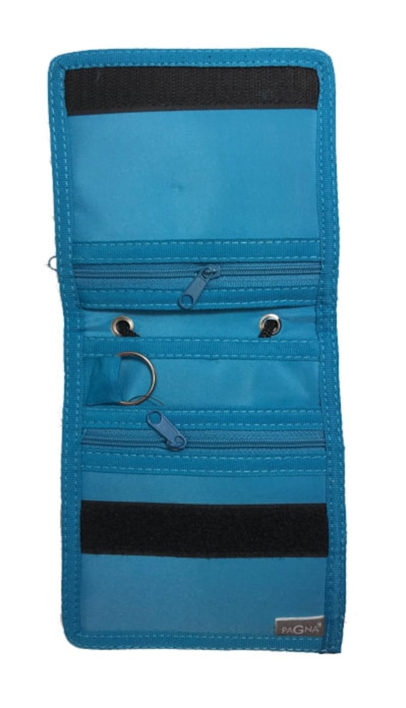 Maße ca. 13 x 15 cm, aus 100% Polyester - strapazierfähig, spritzwassergeschützt und abwischbar. Mit Umhängeband, Klettverschluss und praktischen Fächern: 1 Reißverschlussfach außen, 3 Innenfächer + 2 mit Reißverschluss innen, plus Schlüsselring.