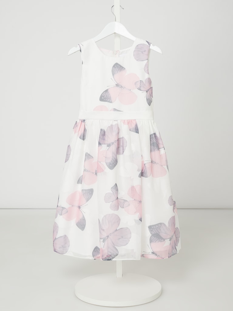 Suchst du ein süßes Kleid für deine Tochter? Dieses hübsche Teil mit Blumen-Druck und Schmetterlings-Stickerei ist perfekt!