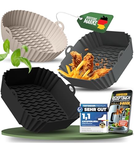 Das Silikon ist lebensmittelecht, hitzebeständig bis 240°C und gibt keine schädlichen Stoffe ab. Weich, geruchsneutral und super einfach zu reinigen – einfach abwaschen oder in die Spülmaschine stecken. Passt für alle Heißluftfritteusen mit Metallkörben.