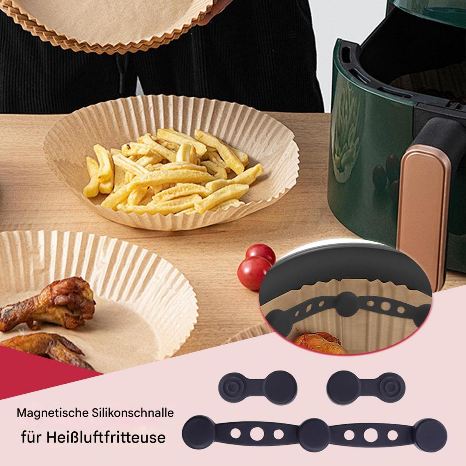 Schluss mit flatterndem Backpapier in der Heißluftfritteuse! Dieses 12-teilige Set mit Magnet-Schnallen aus Silikon hält dein Backpapier sicher fest – kein Verrutschen, kein Kontakt mit den Heizelementen. Einfach die langen Streifen und kleinen Punkte an den Metallkorb heften, und schon bleibt alles da, wo es sein soll.