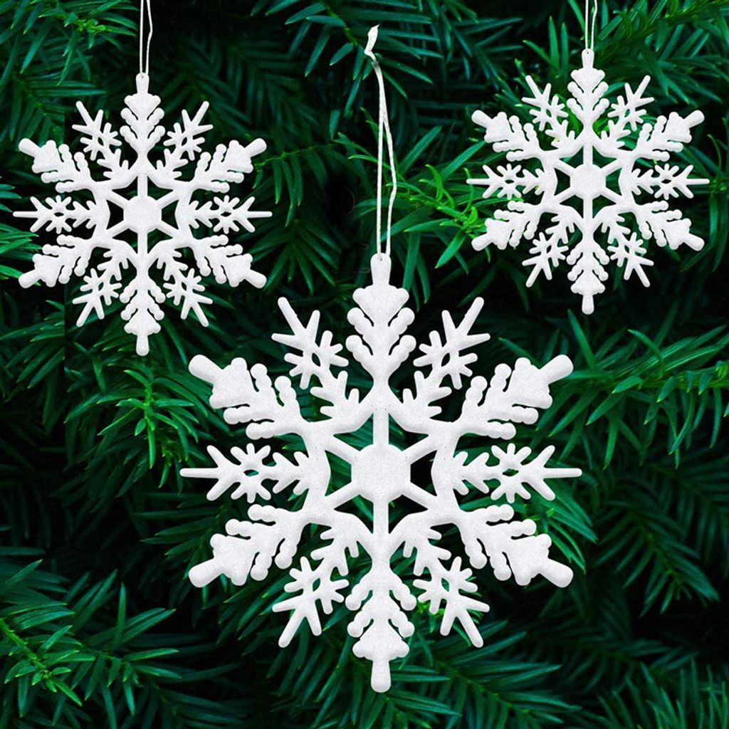 Boah, diese Schneeflocken-Deko macht deinen Weihnachtsbaum richtig festlich! 24 Stück im Set - davon 4 verschiedene Designs. Jede Schneeflocke ist ca. 10,5x10,5cm groß und hat nen silbernen Aufhängefaden. Der weiße Glitzer-Effekt sieht total edel aus und funkelt wunderschön im Lichterglanz. Aus stabilem Plastik - halten ewig und brechen nicht so leicht. Nicht nur für den Tannenbaum super - auch für Fenster, Türen oder als Raumdekoration. Einfach aufhängen und sofort Weihnachtsstimmung verbreiten! Die Qualität ist richtig gut, nichts billiges. Perfekt um den ganzen Baum zu schmücken oder mit anderen Kugeln zu kombinieren. Macht auch ne mega Figur als Geschenk für Weihnachtsfans. Einfach auspacken, aufhängen und dich an der winterlichen Pracht erfreuen!