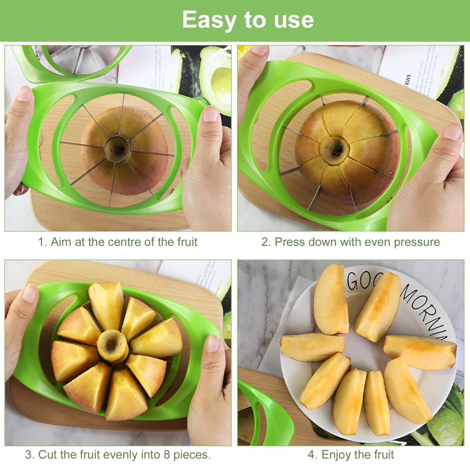 Das Teil ist nicht nur für Äpfel super - auch Birnen, Avocados und andere runde Früchte lassen sich damit super verarbeiten. Die Klingen sind aus scharfem Edelstahl und der grüne Griff liegt gut in der Hand.