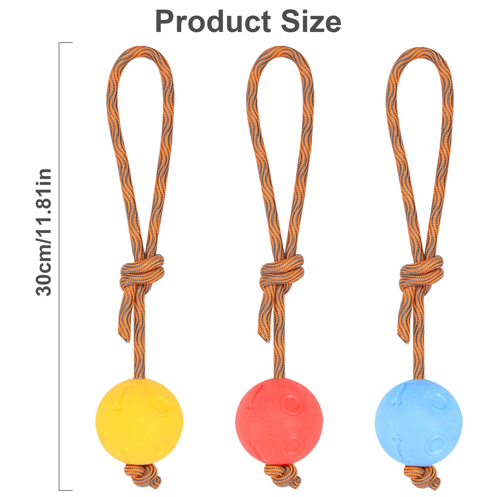 Dein Hund liebt Bälle? Dann wird er diese 3 Hundebälle mit Schnur lieben! Jeder Ball hat 5cm Durchmesser plus 31cm lange Schnur - perfekt zum Werfen und Apportieren. Die bunten Farben (Rot, Gelb, Blau) ziehen sofort die Aufmerksamkeit deines Vierbeiners auf sich. Besonders clever: Die weiche, unebene Oberfläche reinigt die Zähne und massiert das Zahnfleisch - beugt Zahnstein und Mundgeruch vor! Aus flexiblem TPR-Material gefertigt, sind die Bälle extrem bissfest und elastisch. Die robuste Nylonschnur hält auch wildestem Ziehen stand. Perfekt für interaktive Spiele wie Werfen, Fangen und Tauziehen. Und das Beste: Die Bälle schwimmen, sind also ideal für Wasserspiele!