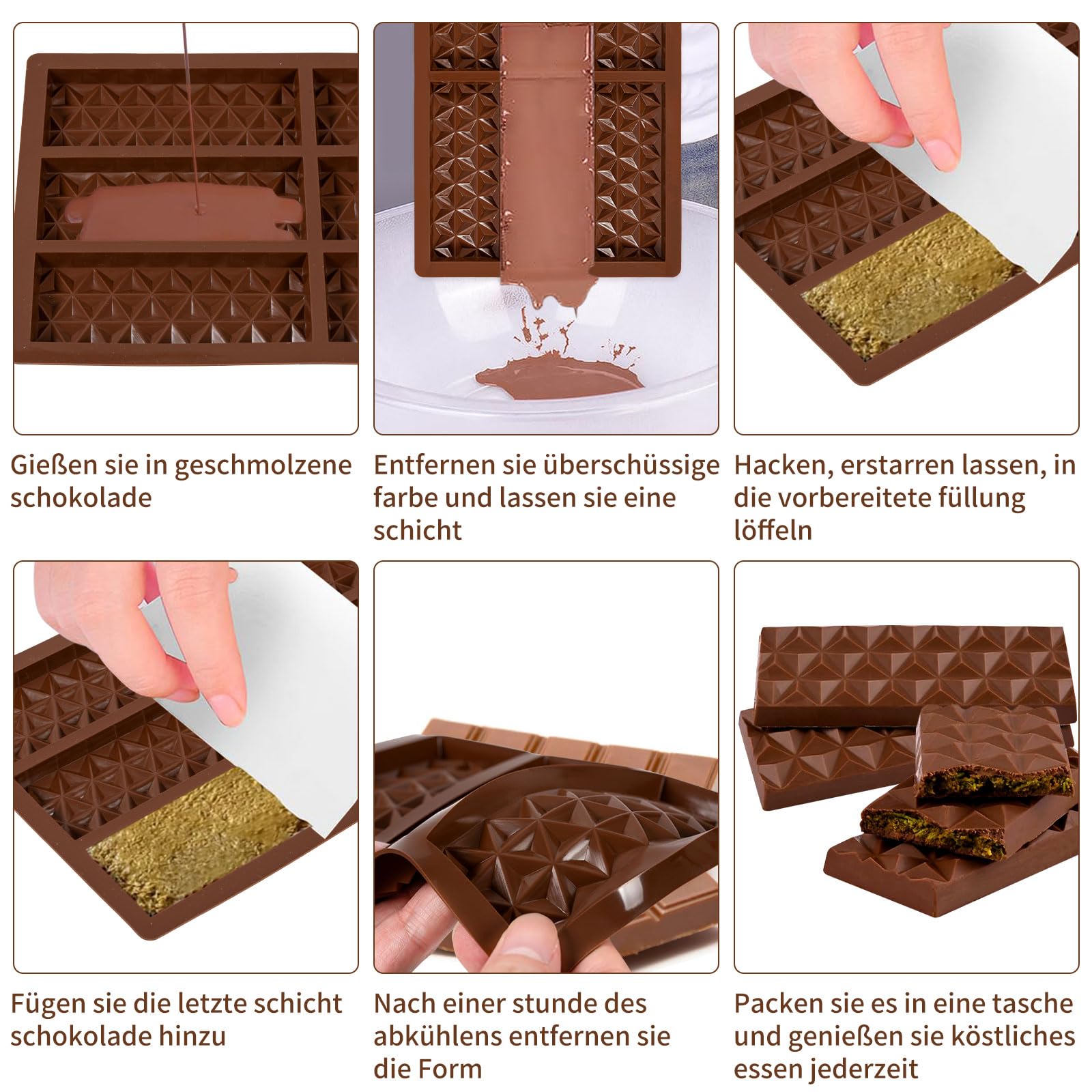 Kreiere deine eigenen Schokoladen-Kreationen! Diese 2 Silikonformen im Dubai-Stil sind perfekt für selbstgemachte Schokolade. Maße: 25x13,5x2 cm - extra tief für volle Geschmackserlebnisse. Aus 100% lebensmittelechtem Silikon - BPA-frei und absolut unbedenklich. Hitzebeständig von -40°C bis +230°C - für Ofen, Mikrowelle und Gefrierschrank. Antihaft-Beschichtung - Schokolade löst sich perfekt ohne Fetten. Perfekt für Dubai-Schokolade mit Pistazien, Pralinen, Desserts oder Seifen. Einfach zu reinigen - spülmaschinenfest. Flexible Form - einfaches Entformen ohne Bruchgefahr. Ob für Hobby-Konditoren oder Profis - mit diesen Formen wird jeder zum Schokoladen-Künstler. Einfach Schokolade schmelzen, in die Form gießen, kühl stellen - und genießen!