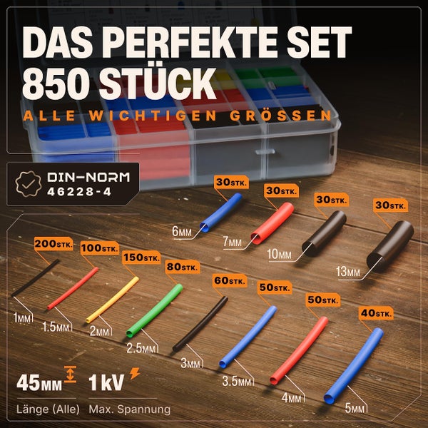 Das ultimative Sortiment für alle Elektroarbeiten! Dieses 1250-teilige Schrumpfschlauch Set enthält 12 verschiedene Größen in mehreren Farben. Mit 2:1 Schrumpfverhältnis - ziehen sich beim Erhitzen auf die Hälfte ihrer ursprünglichen Größe zusammen. Aus hochwertigem Polyolefin, flammhemmend, isolierend, hitzebeständig und langlebig. Die innere Klebstoffschicht schmilzt beim Erhitzen und bildet eine wasserdichte, luftdichte Versiegelung. Perfekt für Kabelreparaturen, elektrische Isolierung, Lötstellen und mehr. Vorgeschnitten für sofortigen Einsatz. Alles ordentlich sortiert in einer praktischen Aufbewahrungsbox mit separaten Fächern. Dein komplettes Set für professionelle Elektroarbeiten - ob im Heimwerker-Bereich oder für den Profi-Einsatz!