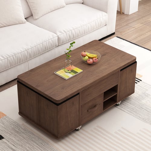 Dieser Couchtisch ist echt clever! Er verwandelt sich im Handumdrehen von gemütlichem Couchtisch in praktischen Esstisch. Einfach die Tischplatte mit dem hydraulischen Mechanismus anheben - schon hast du mehr Platz für Essen, Arbeit oder Spieleabende.\n\nMit 100x51cm Grundmaß und 47cm Höhe passt er perfekt in jedes Wohnzimmer. Die weiße Farbe mit holzfarbenen Akzenten sieht modern und stylisch aus. Und der Stauraum ist genial: 2 Schubladen und 3 offene Fächer für alles, was man so braucht.\n\n50kg trägt der Tisch - das reicht für alles! Selbst wenn die Platte hochgeklappt ist, hält er noch 20kg aus. Perfekt für Laptop, Bücher oder das Abendessen mit Freunden.\n\nAchtung: Kommt in 2 Paketen an! Bitte warte mit dem Aufbau, bis beide da sind. Aber keine Sorge, das Zusammenbauen ist echt einfach.\n\nOb fürs Homeoffice, als Esstisch oder einfach nur zum Chillen - dieser Tisch kann alles. Mach dein Wohnzimmer flexibel und hol dir diesen praktischen Allrounder!