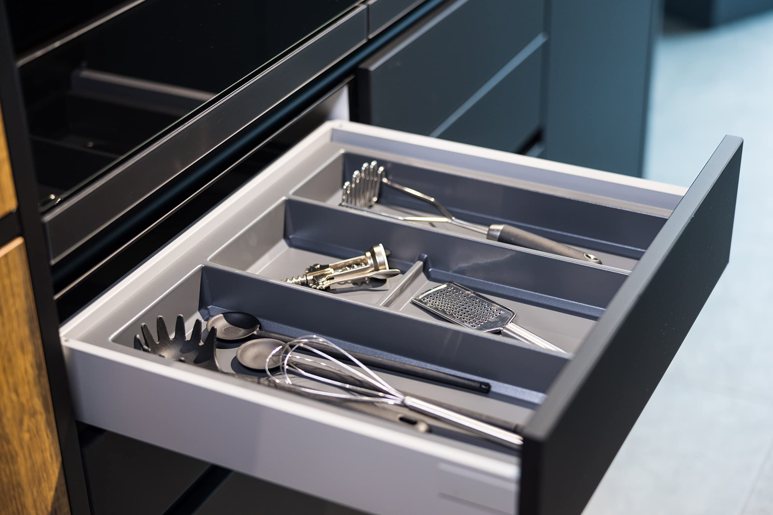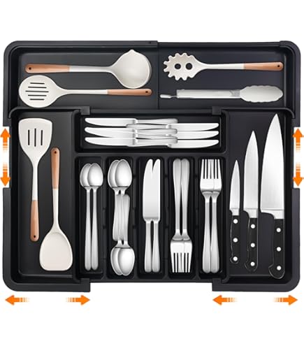 Endlich Ordnung in der Besteckschublade! Dieser Kitsure Besteckkasten in Schwarz ist die perfekte Lösung für unordentliche Schubladen. Maße: 35,6 x 3,6 x 29,0-51,5 cm - passt in die meisten Standard-Küchenschubladen. Super praktisch: Alles hat seinen festen Platz - Messer, Gabeln, Löffel, Teelöffel. Einfach einsortieren und schon findest du alles sofort. Aus robustem Material - hält lange und sieht dabei noch stylisch aus. Die schwarze Farbe passt zu jeder Kücheneinrichtung. Besonders praktisch: Du siehst sofort, wenn Besteck fehlt. Perfekt für Familien, Singles oder Paare - einfach für jeden, der Wert auf Ordnung legt. Mach deine Küche aufgeräumt und effizient - ohne großes Suchen. Einfach ein Game-Changer für die Küchenorganisation!
