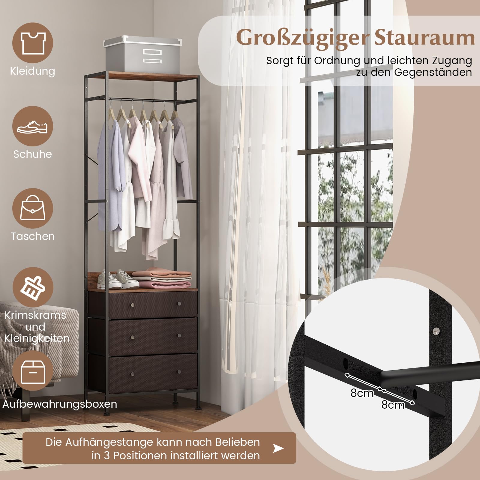Noch ein Plus: Du kannst die Kleiderstange in 3 verschiedenen Höhen anbringen. So passt du ihn perfekt an deine Bedürfnisse an - ob für lange Mäntel oder kurze Jacken.