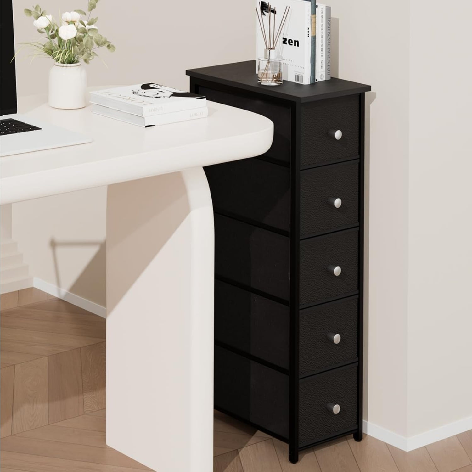 Diese VASZOLA Kommode ist perfekt für kleine Räume! Mit nur 20cm Breite passt sie in jede Ecke - zwischen Waschmaschine und Trockner, ins Bad, Schlafzimmer oder Wohnmobil. Hat 5 Stoffschubladen in verschiedenen Größen - unten tiefer für größere Sachen, oben flacher für Kleinkram. Die Schubladen schließen fast lückenlos - kaum Staub kommt rein! Oben ist ne Holzplatte mit Sicherungsleiste - nichts fällt runter. Und das Beste: Verstellbare Füße für jeden Boden, oder wechsel auf Räder wenn du sie mobil brauchst. Muschelgriffe sehen nicht nur gut aus, sondern sind super praktisch. Der Aufbau geht fix - in 15 Minuten mit Videoanleitung steht sie! Aus stabilem Metallgestell - nichts bricht zusammen. Ein Traum für alle mit Platzproblemen!