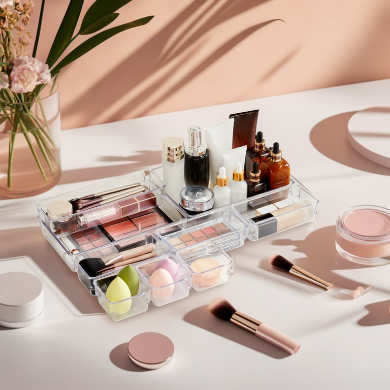Endlich Ordnung in deinen Schubladen! Dieses 7-teilige Organizer-Set in kristallklarem transparentem Design bringt System in dein Chaos. Vier verschiedene Größen lassen sich flexibel kombinieren - perfekt für Kosmetik, Schmuck, Büroartikel oder Küchenutensilien. Du siehst sofort, was wo ist! Einfach in die Schublade stellen und nach Belieben anordnen. Die Organizer sind super leicht zu reinigen - einfach abwischen oder abspülen. Ob im Bad, Schlafzimmer, Büro oder Küche - überall sorgt dieses Set für perfekte Übersicht. Mach Schluss mit dem lästigen Suchen und schaff dir deine persönliche Ordnung! Einfach platzieren, einräumen und sich über die aufgeräumten Schubladen freuen. Ein Must-have für alle Ordnungsliebenden!