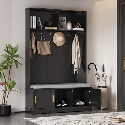 Endlich Ordnung im Flur! Diese praktische Garderobe mit Sitzbank ist das perfekte Möbelstück für deinen Eingangsbereich. Im schicken Vintagebraun sieht sie nicht nur gut aus, sondern ist auch super funktional. Mit 8 stabilen Haken hast du genug Platz für Jacken, Mäntel und Taschen der ganzen Familie. Die Sitzbank ist mit über 80 kg belastbar - da kannst du dich in aller Ruhe hinsetzen, um deine Schuhe anzuziehen. Unter der Bank findest du ein praktisches Schuhregal, und seitlich gibt's noch ein extra 3-stufiges Lagerregal mit Schublade für Schlüssel, Handschuhe und andere Kleinigkeiten. So hast du alles griffbereit und nichts verlegt sich mehr! Das Design ist richtig durchdacht: Die verstärkten Beine und Trennwände sorgen für Stabilität, und die abnehmbaren Haken lassen sich bei Bedarf easy austauschen. Ob im Flur, Schlafzimmer oder Wohnzimmer - dieses Multitalent fügt sich perfekt in deine Einrichtung ein und schafft sofort mehr Ordnung. Kein Chaos mehr mit herumliegenden Schuhen und Jacken - alles hat seinen festen Platz. Ein echter Hingucker und praktisch obendrein!