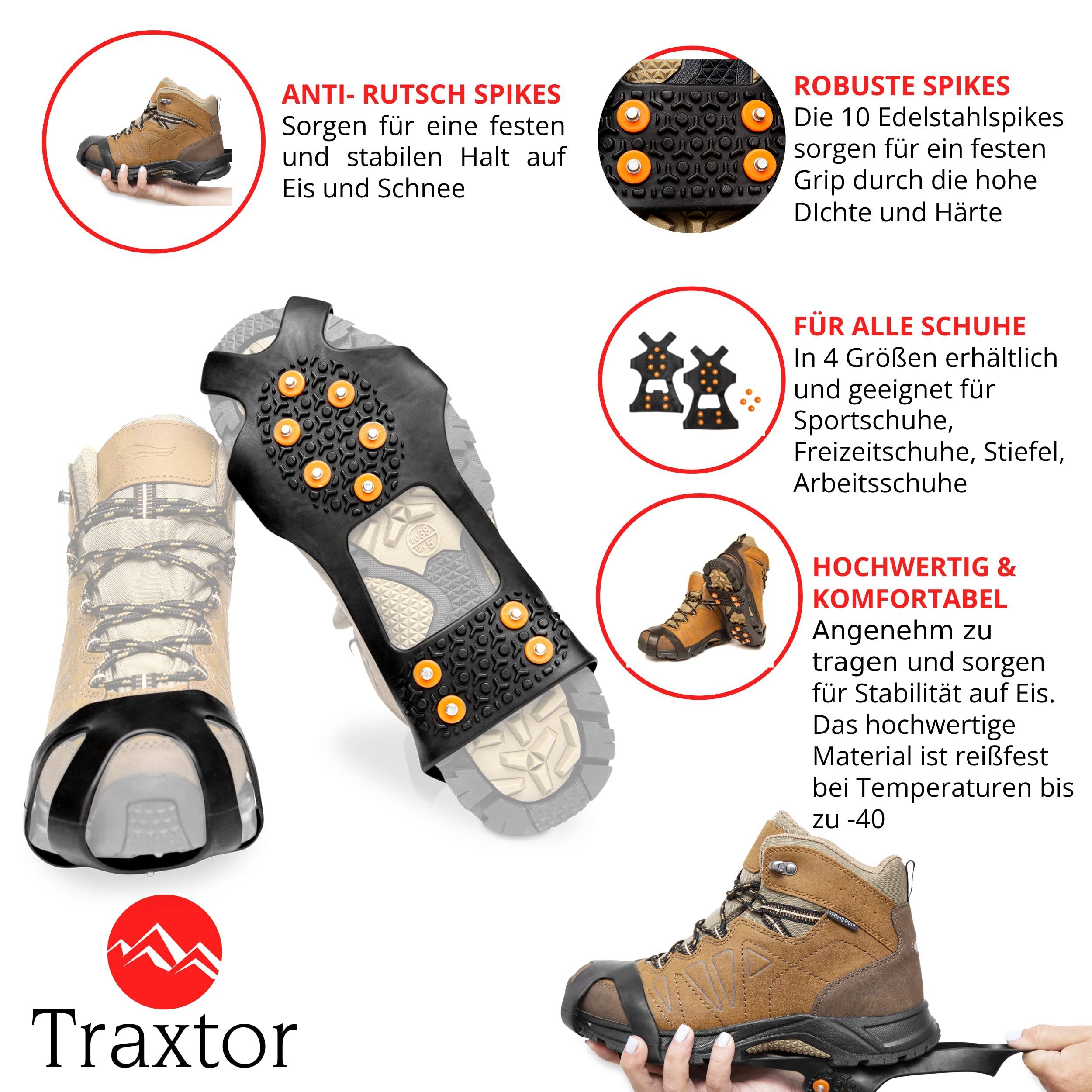 Bei Glätte und Schnee sind diese Schuhspikes dein bester Freund! Mit 10 Traktionsstollen pro Schuh geben sie dir auf eisigen Wegen sicheren Halt. Das coole: Die dehnbaren Riemen passen sich jeder Schuhgröße an - ob Turnschuh, Wanderstiefel oder Winterboot. Einfach vorne an den Zehen und hinten an der Ferse befestigen, schon kannst du rutschfrei wandern, klettern oder angeln gehen. Aus robustem Gummi gemacht, halten sie ewig und sind trotzdem bequem. Für Erwachsene und Kinder gleichermaßen geeignet - so macht Winter-Sport richtig Spaß!
