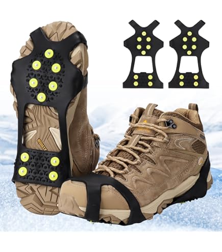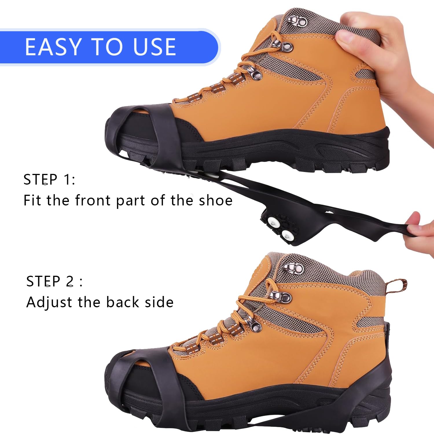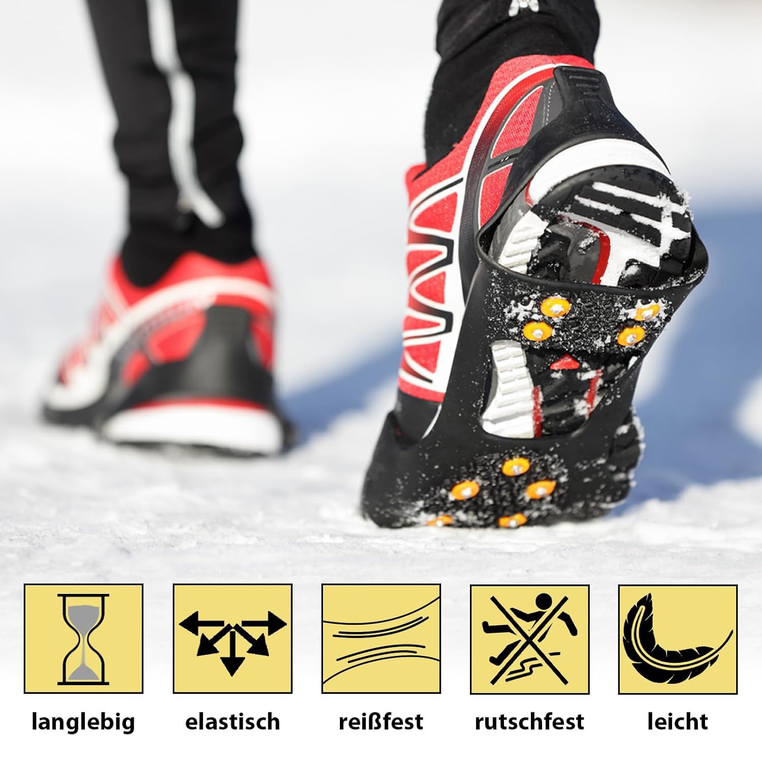 Sicher auf Eis und Schnee! Diese Steigeisen mit 8 Stahl-Zacken geben dir perfekten Halt. Größe M, 10,5 cm breit und 24,3 cm lang. Aus TPE und Metall - super elastisch und passen an fast jeden Schuh. Einfach überziehen, der elastische Verschluss hält bombenfest. Kompakt faltbar, leicht zu transportieren. Perfekt für Winter-Wanderungen, Eisfischen oder den Weg zur Arbeit. Damit rutschst du garantiert nicht mehr aus!