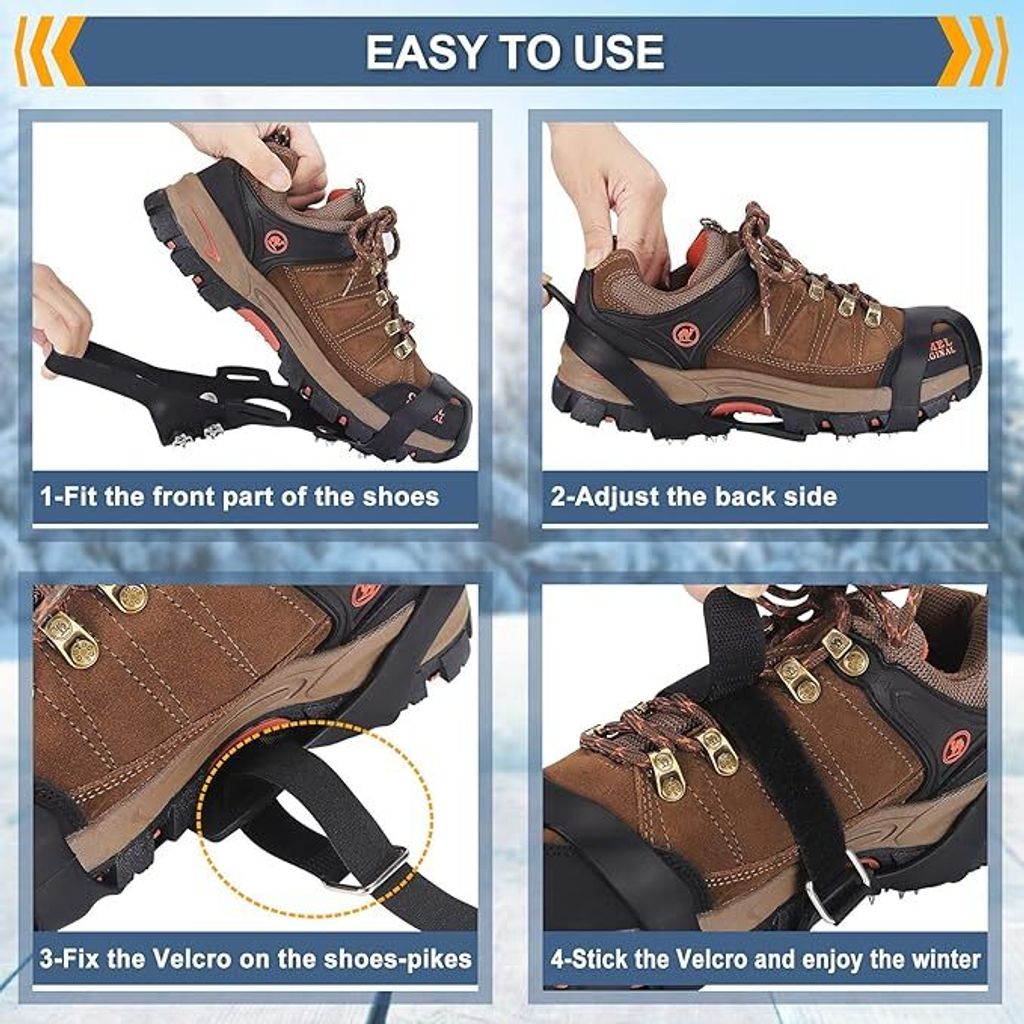 Bei Eis und Schnee gibt's kein Rutschen mehr mit diesen praktischen Schuhspikes! Das 4-Paar-Set passt auf fast jede Schuhgröße und sorgt für sicheren Halt auf vereisten Wegen, schneebedeckten Pfaden oder matschigem Untergrund. Aus strapazierfähigem thermoplastischem Gummi gefertigt, sind sie leicht und dennoch extrem langlebig. Die eingelassenen Stahnnägel bieten fantastische Traktion und verhindern lästiges Ausrutschen. Anziehen ist super einfach: Einfach über die Schuhspitze und Ferse ziehen, festziehen und schon bist du bereit für winterliche Abenteuer! Ob beim morgendlichen Weg zur Arbeit, beim Winterwandern in den Bergen oder beim Spaziergang mit dem Hund - diese Spikes geben dir die nötige Sicherheit. Und wenn du sie nicht brauchst, lassen sie sich klein zusammenfalten und in der Tasche verstauen. Perfekt für Männer und Frauen jeden Alters - von Teenagern bis zu Senioren. Mit 4 Paaren im Set hast du immer Ersatz parat oder kannst die Familie ausstatten!