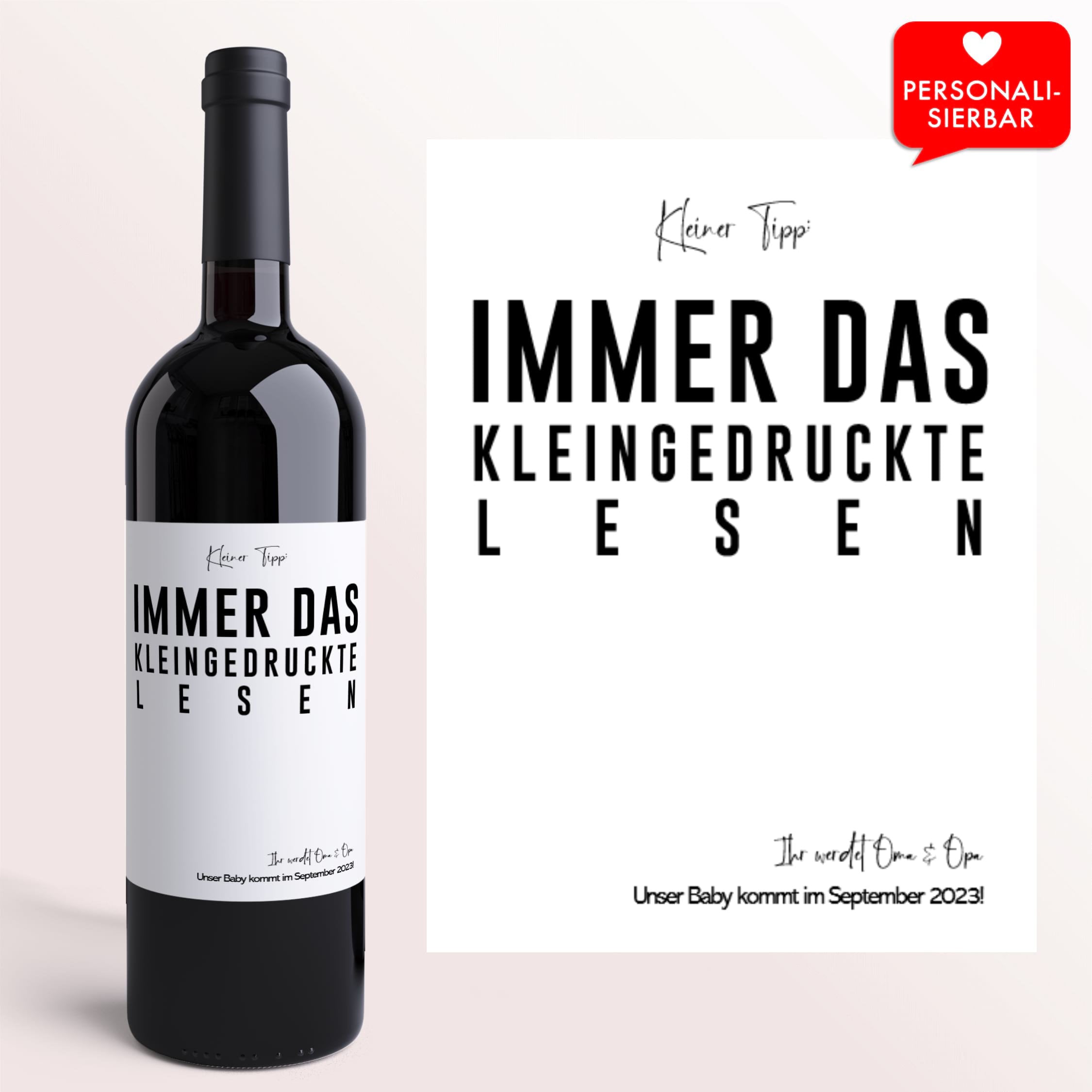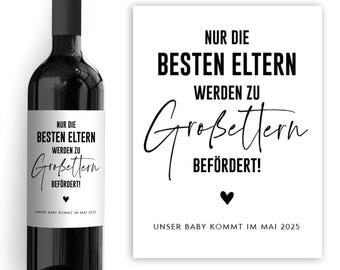 Was für eine tolle Idee: Mit diesen personalisierten Weinetiketten verkündest du die Schwangerschaft auf ganz besondere Weise! Die Etiketten sind 10x12 cm groß, aus seidenmattem, feuchtigkeitsbeständigem Papier und werden von Hand personalisiert. Einfach die Folie abziehen und auf eine 0,75 L Weinflasche kleben. Perfekt, um den werdenden Großeltern die freudige Nachricht zu überbringen. Ein einzigartiges und emotionales Geschenk, das sicher in Erinnerung bleibt. Schneller Versand und guter Kundenservice inklusive. Mach den besonderen Moment unvergesslich!