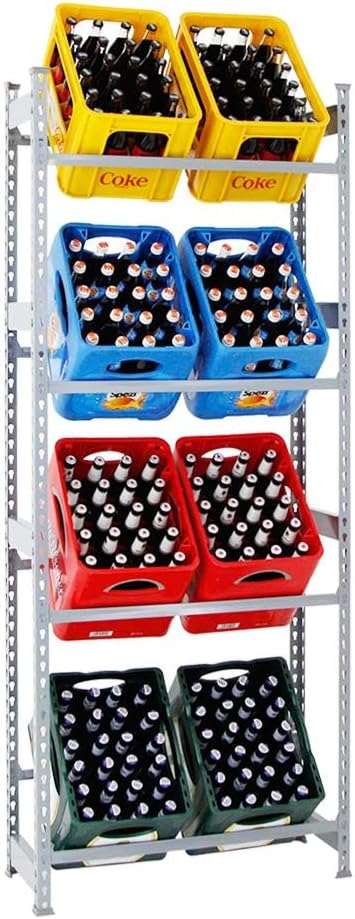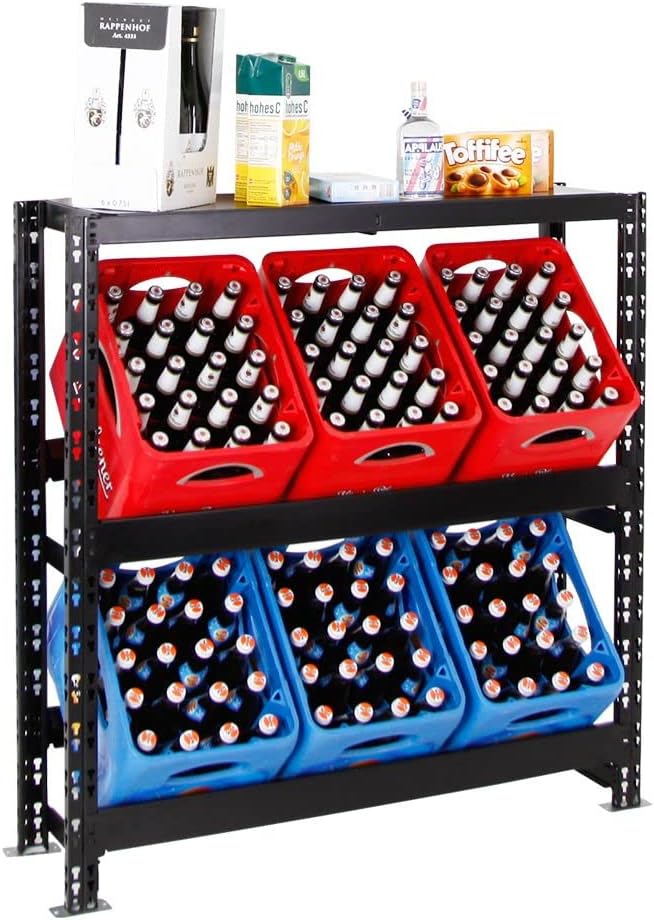 Endlich Ordnung im Getränkevorrat! Dieses Regal schafft Platz für ganze 6 Getränkekisten - und hält dabei satte 150kg aus. Maße: 32cm tief, 104cm breit, 118cm hoch. \\n\\nDas coole Design hat praktische Haken an beiden Seiten für Flaschenöffner und Kleinkram. Der 15° Neigungswinkel macht's super einfach, die Kisten rauszuziehen. \\n\\nOben gibt's noch ne Ablage aus Holz für Getränke oder Kaffeebohnen - hält 50kg. Mit verstellbaren Füßen für perfekten Stand auf unebenen Böden. \\n\\nMontage ist echt easy - alle Teile sind markiert, Werkzeug und Anleitung liegen bei. Passt nicht nur für Getränke, sondern auch mit Holzkisten oder Plastikboxen für Obst und Gemüse. Sieht gut aus und ist mega praktisch!