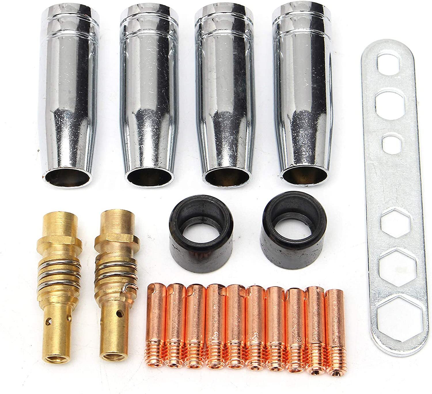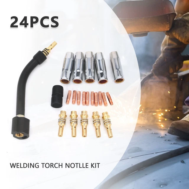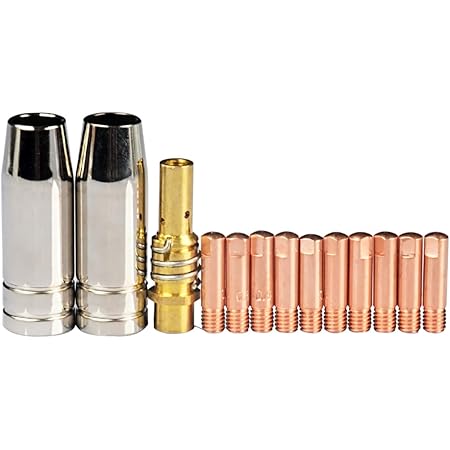 Für alle Schweiß-Profis und Hobby-Schweißer! Dieses 12-teilige MIG MAG Zubehör-Set ist genau das Richtige, wenn du mit AK-15 oder MB-15 Brennern arbeitest. Alles aus hochwertigem Kupfer - das spürt man in der Qualität!\n\nWas ist alles dabei? 2 Gasdüsen (konisch, 18mm Außendurchmesser), 10 Stromdüsen für 0,8mm Draht und 1 Düsenträger inklusive Haltefeder. Die perfekte Kombination für den täglichen Einsatz in Werkstatt oder Betrieb.\n\nDie Maße passen genau: Gasdüsen 53mm lang, Stromdüsen 25mm mit M6 Gewinde. So musst du nicht lange suchen - alles ist kompatibel und sofort einsatzbereit.\n\nWarum Kupfer? Ganz einfach: Bessere Wärmeleitfähigkeit, längere Lebensdauer und weniger Verklebungen. Dein Schweißbrenner wird es dir danken!\n\nOb für Reparaturen, Metallbau oder kreative Projekte - mit diesem Set hast du die wichtigsten Verschleißteile immer griffbereit. Kein Produktionsausfall mehr wegen fehlender Ersatzteile. Einfach auspacken und weiterschweißen!