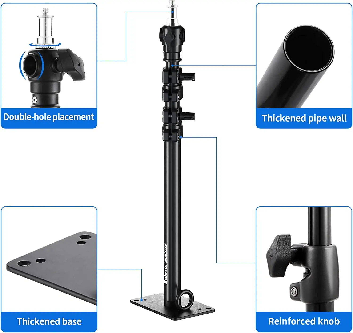 Mit den 1/4\ und 3/8\ Gewinden passt er zu fast allem: COB-Lampen, Kameras, Mikrofonen, Monitoren... Perfekt für Fotostudios, Friseure oder sogar Zahnarztpraxen!