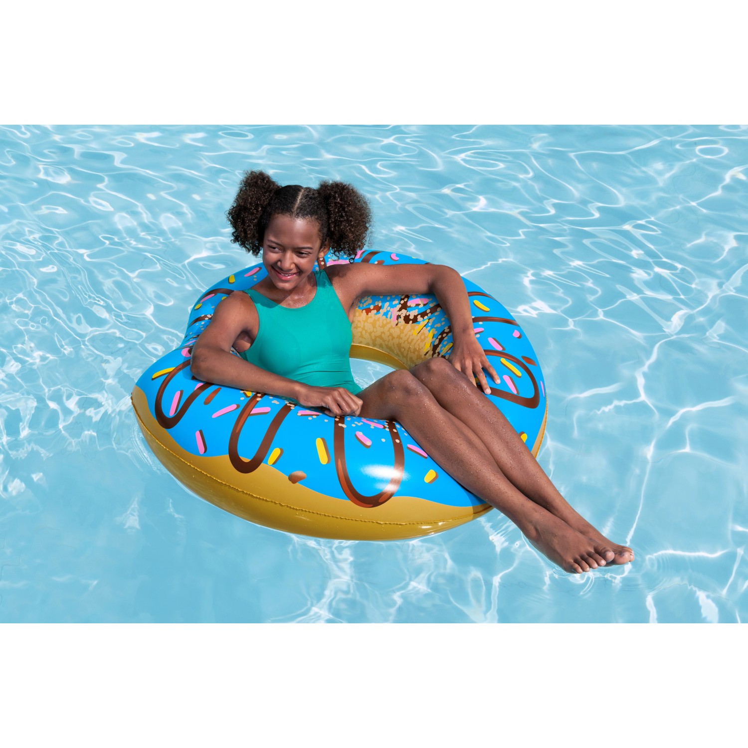 Spaß garantiert mit diesem riesigen Donut-Schwimmring! Mit 120cm Durchmesser bietet er genug Platz für Erwachsene und Kinder. Das lustige Donut-Design mit buntem 'Biss-Muster' sorgt für gute Laune im Wasser. Aus robustem, umweltfreundlichem Material mit gutem Auftrieb. Die weiche Oberfläche ist hautfreundlich und angenehm. Perfekt für Pool, See oder Meer - ob zum Relaxen oder Spielen. Einfach aufblasen und ab ins kühle Nass! Der dicke Innenring sorgt für Stabilität und verhindert Umkippen. Besonders praktisch: leicht zu transportieren und platzsparend zu verstauen. Ideal für Sommerpartys, Strandurlaub oder den eigenen Pool. Ein echter Hingucker, der garantiert für strahlende Gesichter sorgt. Hol dir den Sommer ins Wasser!