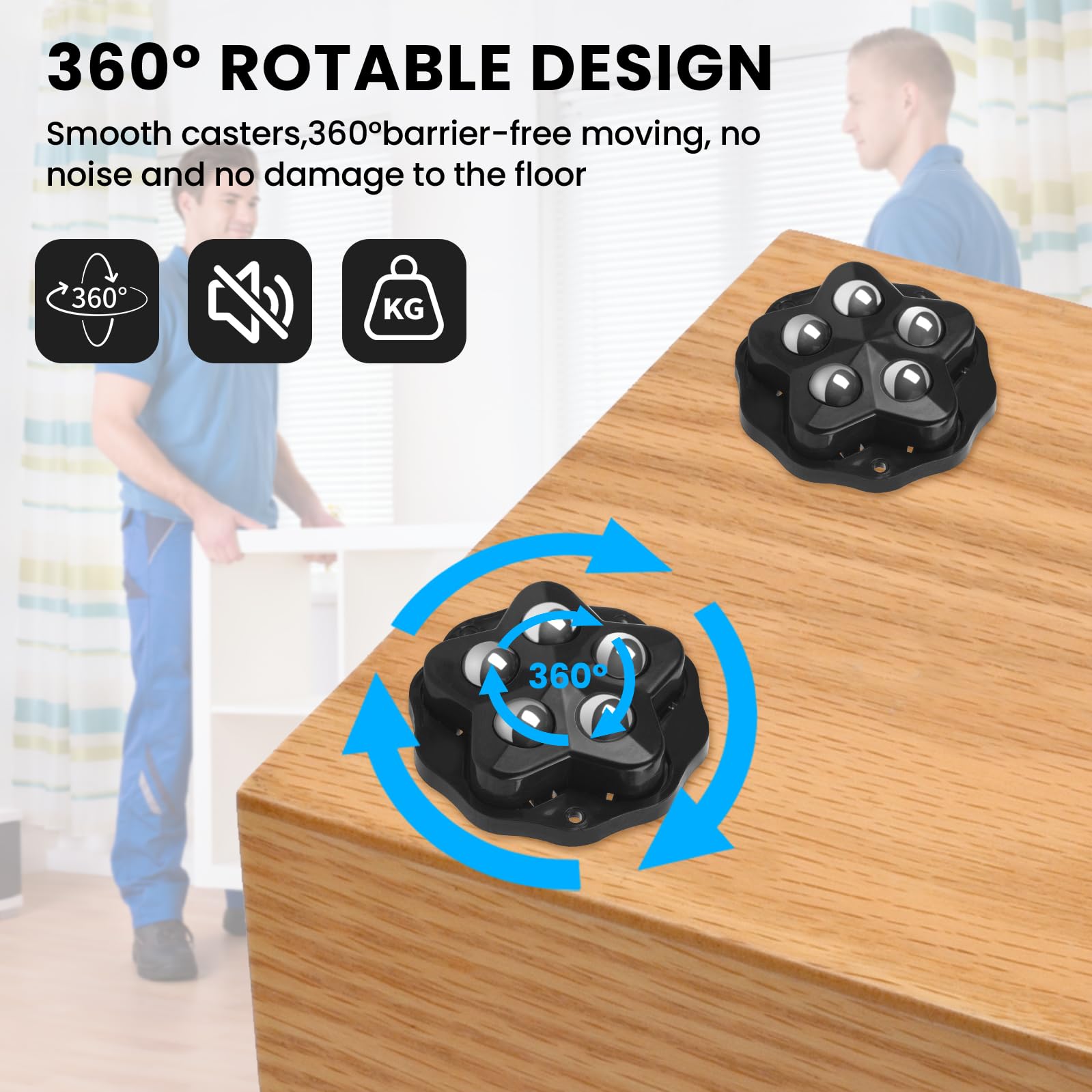 Jede Rolle hat 5 Mini-Räder, die sich um volle 360° drehen. Super für Couchtische, Schränke, Aufbewahrungsboxen oder Mülleimer. Tragkraft bis zu 200kg - das ist echt stabil!