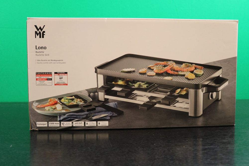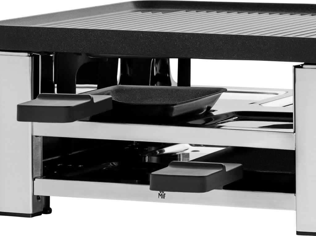 Leute, dieses WMF Raclette ist der absolute Bringer für gemütliche Abende! Für bis zu 8 Personen mit 8 keramikbeschichteten Pfännchen und Spateln - alles spülmaschinengeeignet, yeah! Mit 1500 Watt Heizleistung wird alles schön gleichmäßig gratiniert. Die variable Temperaturkontrolle lässt dich genau einstellen, wie heiß es werden soll. LED-Anzeigen zeigen an wenn's ready ist. Das genialste Feature: Die Ablage unter der Grillplatte für ungenutzte Pfännchen - so bleibt der Tisch aufgeräumt! Aus Cromargan Edelstahl und in schickem Schwarz sieht es einfach hochwertig aus. Ob mit Freunden, Familie oder auf Partys - damit wird jedes Raclette-Essen zum Event. Einfach anschalten, Käse drauf und ab in den Mund! Perfekt für Winterabende oder gesellige Runden. Hol dir den Grill und werde zum Raclette-König!