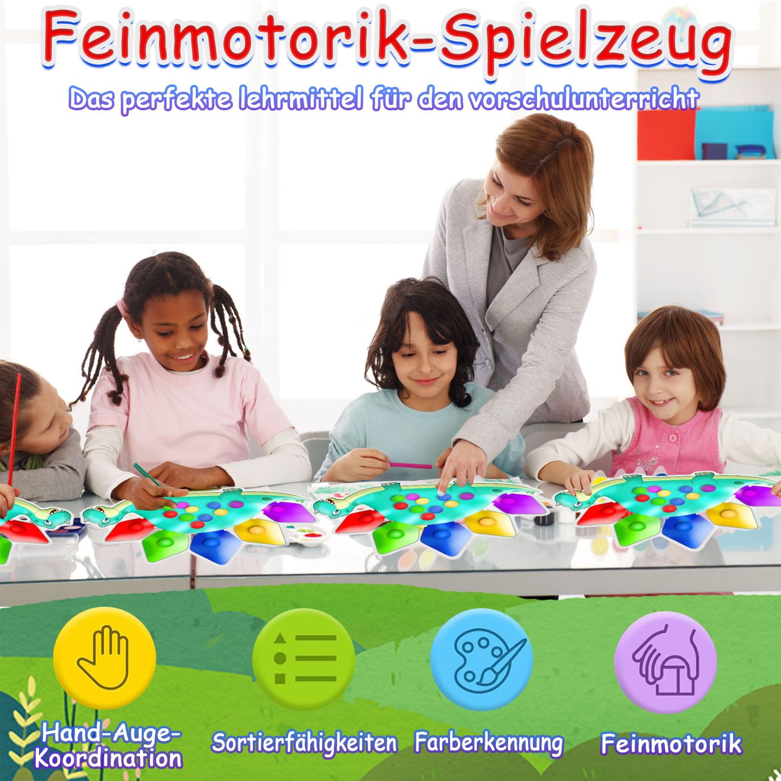 Lernspaß mit dem niedlichen Dinosaurier! Dieses Sensorik-Spielzeug begeistert Kinder ab 3 Jahren und fördert spielerisch die Entwicklung. Die bunten Gummikügelchen können durch Drücken und Schieben sortiert werden - das trainiert Feinmotorik und Hand-Auge-Koordination. Gleichzeitig lernen die Kleinen Farben und Formen kennen. Das Gel-Innenleben bietet ein beruhigendes sensorisches Erlebnis, ideal bei starken Emotionen. Mit 22x14cm Größe perfekt für unterwegs - ob im Auto, im Wartezimmer oder zu Hause. Aus hochwertigem, leicht zu reinigendem Material. Ein tolles Geschenk für Geburtstage, Weihnachten oder einfach so. Einfach loslegen und spielerisch lernen!