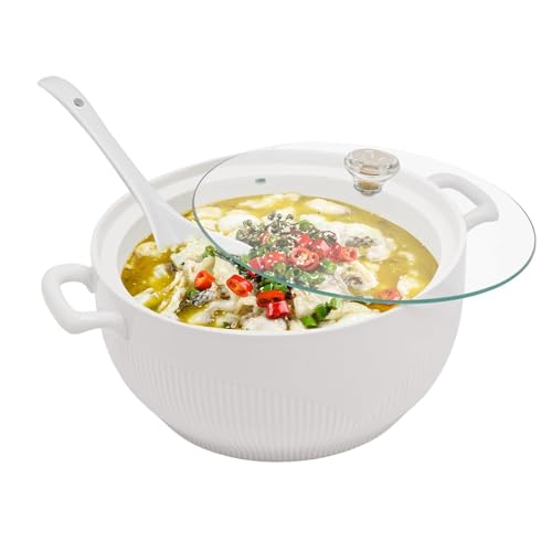 Diese wunderschöne Suppenterrine aus Keramik macht jedes Gericht zum Eyecatcher! Perfekt für Suppen, Eintöpfe, Müsli oder auch als Servierschüssel für Salate und Nudelgerichte. Mit zwei praktischen Griffen kannst du die heiße Terrine sicher tragen - keine Verbrennungen mehr! Der passende Deckel hält deine Speisen länger warm und der rutschfeste Boden sorgt für stabilen Stand auf jedem Tisch. Aus hochwertiger Keramik mit einzigartiger Reaktionsglasur - jedes Stück ein Unikat! Mikrowellen-, ofen- und spülmaschinengeeignet (außer Induktion). Im Set enthalten: 1 Terrine, 1 Deckel und 1 Löffel - alles was du brauchst! Ob für den täglichen Gebrauch oder besondere Anlässe - diese Terrine ist ein echter Allrounder in der Küche. Deine Gäste werden begeistert sein! Einfach schön, praktisch und langlebig - was will man mehr?