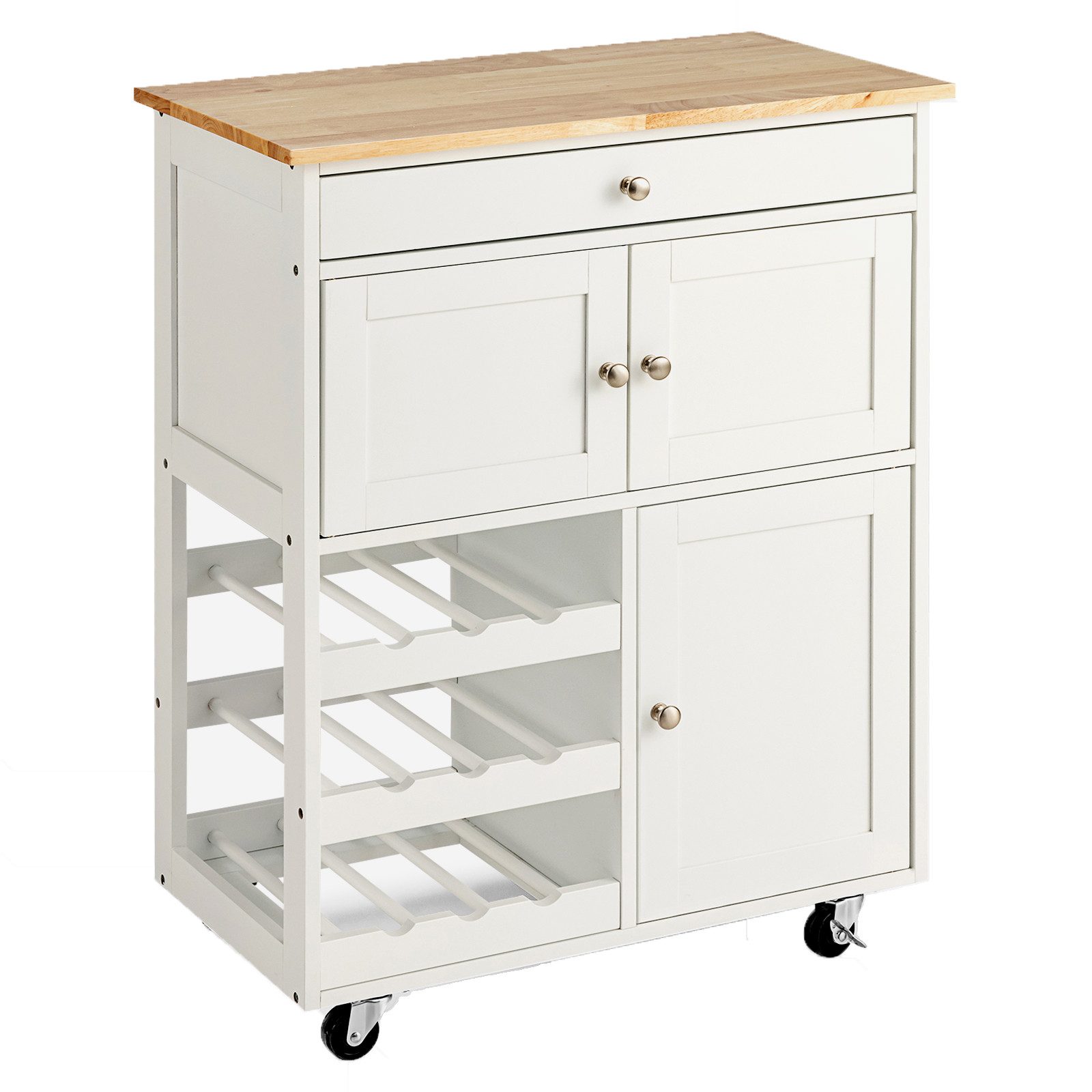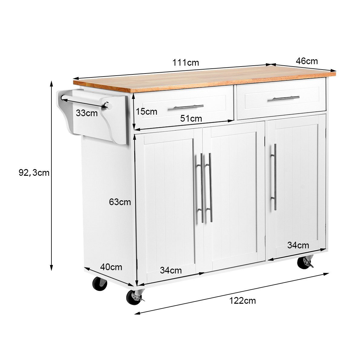Mehr Stauraum und Flexibilität in der Küche? Dieser Küchenwagen ist die Lösung! Mit seinen stattlichen 116x43x89 cm bietet er nicht nur jede Menge Platz, sondern ist auch noch super mobil. Die große Arbeitsplatte aus Gummibaumholz ist perfekt zum Vorbereiten von Speisen oder als zusätzliche Ablagefläche.\n\nUnd was den Stauraum angeht: Zwei Schubladen und zwei offene Regale bieten Platz für alles, was in der Küche so anfällt - ob Töpfe, Gewürze, Küchenutensilien oder Vorräte. Die Schubladen haben jeweils 8 kg Tragkraft, die Regale 20 kg und die Arbeitsplatte sogar stolze 50 kg!\n\nDas robuste Kiefernholz-Gestell und die hochwertige Holzplatte garantieren Langlebigkeit und Stabilität. Die vier Rollen - zwei davon mit Bremsen - machen den Wagen super beweglich. Einfach losschieben und dort positionieren, wo du ihn gerade brauchst.\n\nDer praktische Seitenhandgriff ist nicht nur zum Schieben da, sondern kann auch als Handtuchhalter genutzt werden. So hast du immer ein Küchentuch griffbereit! Die Oberfläche ist leicht zu reinigen und pflegeleicht.\n\nEgal ob in der Küche, im Esszimmer oder sogar im Wohnzimmer - dieser Servierwagen ist überall einsetzbar. Perfekt für kleine Küchen, die zusätzlichen Stauraum brauchen, oder für alle, die gerne flexibel sind. Ein echter Allrounder, der dein Zuhause praktischer und organisierter macht!