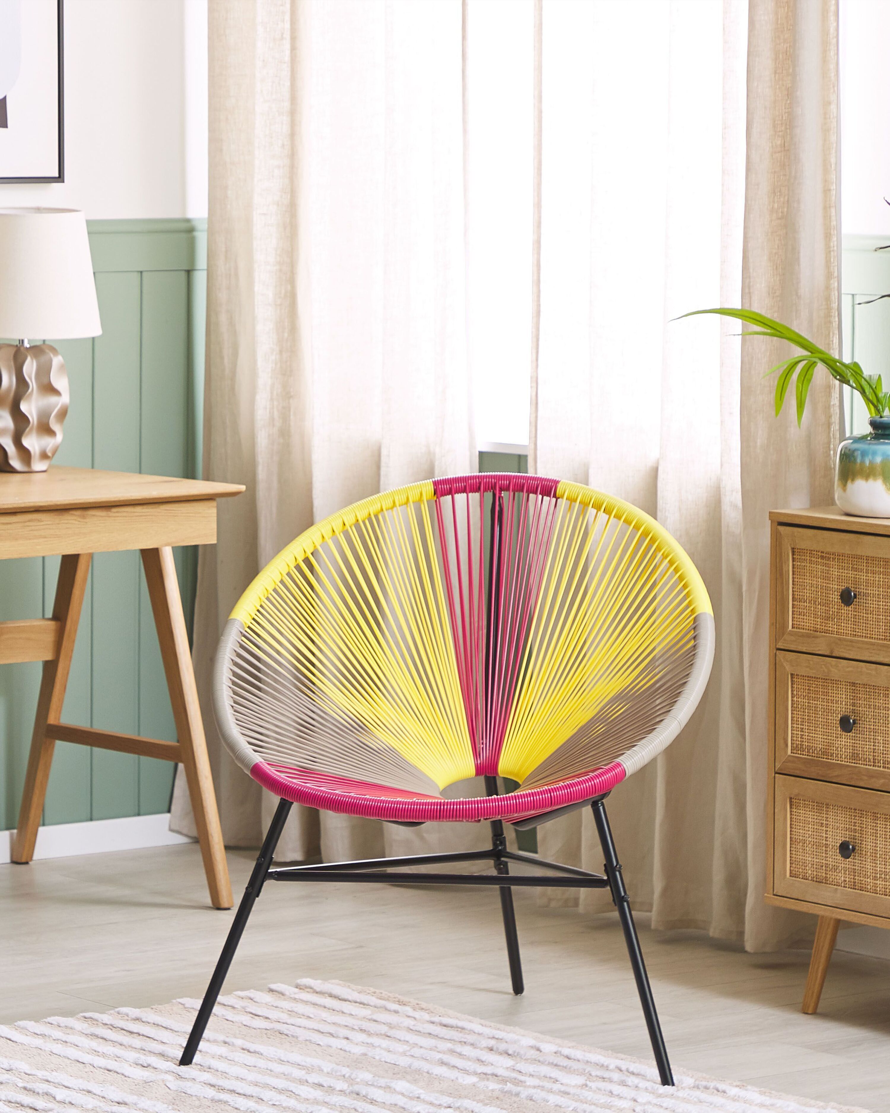 Wow, was für ein Hingucker! Dieser gelbe Acapulco-Stuhl bringt direkt Urlaubsfeeling in deinen Garten oder Wohnraum. Der sogenannte Spaghetti-Sessel hat ein super trendiges Design und ist aus stabilem Stahlgestell mit PE-Rattan-Bespannung. Wetterbeständig und pflegeleicht - perfekt für draußen! Aber auch innen macht er sich mega gut. Leicht und einfach zu transportieren, mit Schutzkappen für den Boden. Die fröhliche gelbe Farbe macht einfach gute Laune! Ob aufm Balkon, Terrasse oder im Wohnzimmer - überall ein Blickfang. Material: Stahlgestell mit PE-Rattan. Farbe: Knalliges Gelb. Maße: Standard-Gartenstuhl-Größe. Wetterfest: Ja, für den Außenbereich geeignet. Gewicht: Leicht zu tragen. Mach deine Sitzecke zum absoluten Highlight mit diesem coolen Sessel!