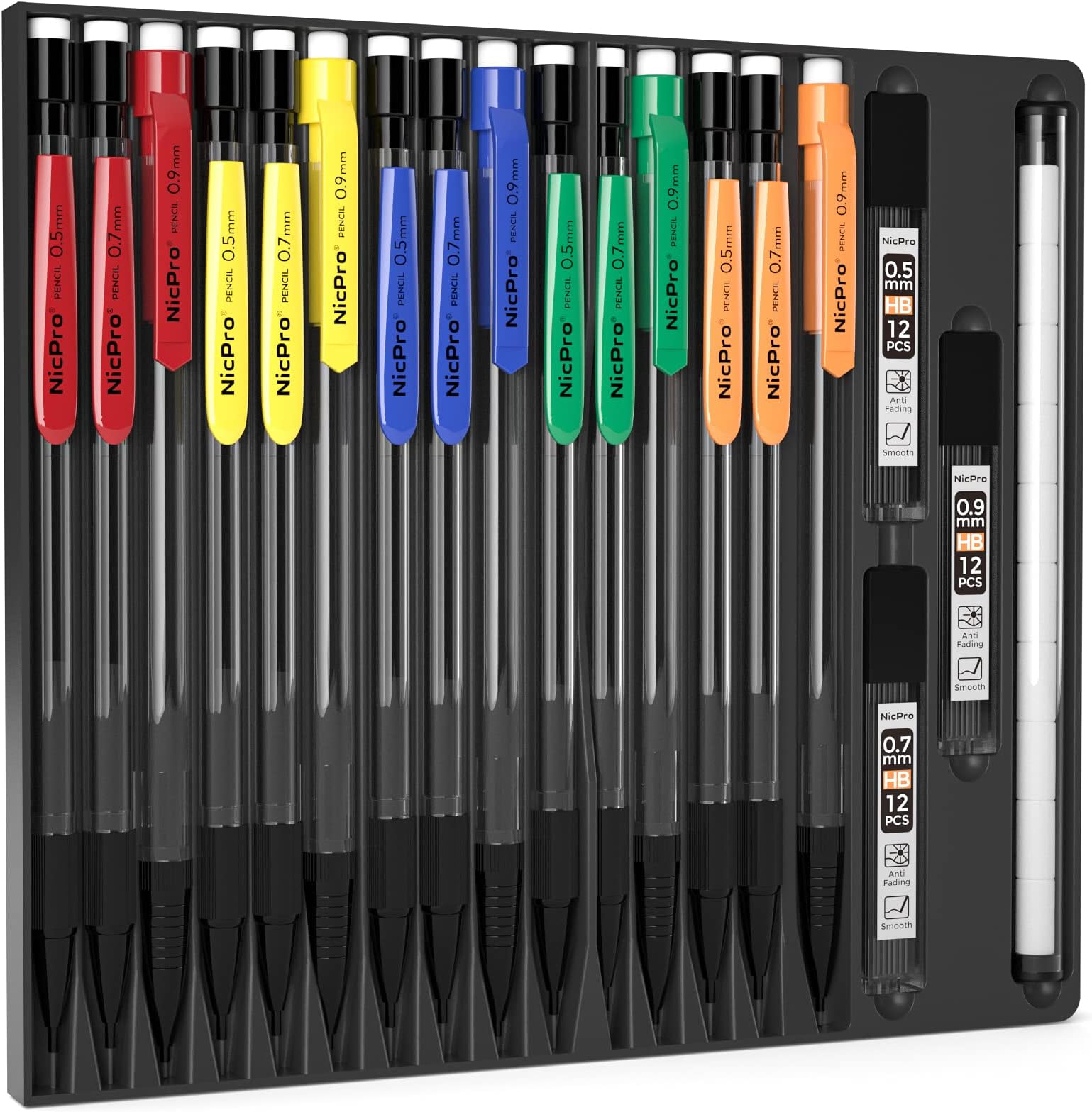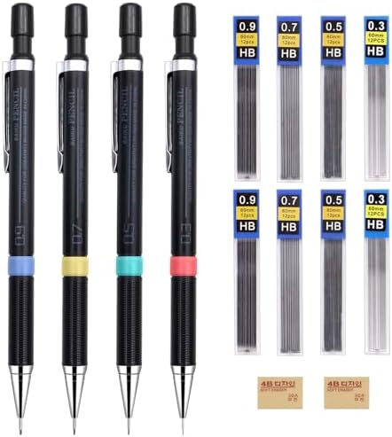 Perfekt für alle, die gerne schreiben, zeichnen oder einfach nur ordentliche Notizen machen! Dieses 4-teilige Druckbleistift-Set enthält alles, was du brauchst: Vier Bleistifte in den Stärken 0,3mm, 0,5mm, 0,7mm und 0,9mm, plus 5 Tuben HB-Minen und 2 Radiergummis. Die rutschfesten Spiralgriffe liegen super in der Hand und sorgen für ermüdungsfreies Schreiben. Das clevere versteckte Radiergummi-Design an der Oberseite ist praktisch für schnelle Korrekturen. Mit den Metallclips kannst du die Stifte bequem an Heften oder Taschen befestigen. Ob für die Schule, Uni, Büro oder zu Hause - dieses Set ist ideal für Schüler, Studenten, Lehrer, Architekten oder einfach jeden, der Wert auf qualitativ hochwertiges Schreibzeug legt. Die harzbasierte Mine ist besonders bruchfest und schreibt wunderbar gleichmäßig. So macht Schreiben und Zeichnen richtig Spaß!