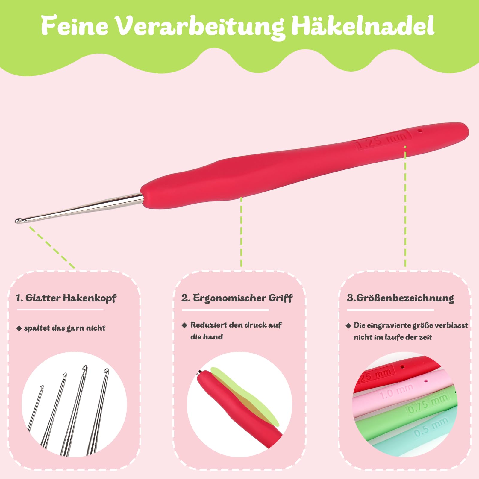 Die weichen Gummi-Griffe sind ein Traum! Ergonomisch geformt und super angenehm in der Hand. Selbst bei stundenlangem Häkeln bekommst du keine schmerzenden Finger.