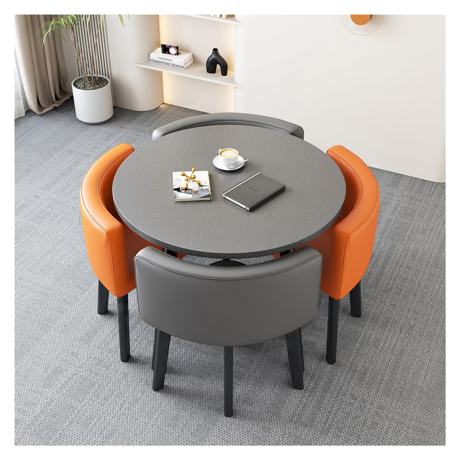 Perfekt für Empfangsbereiche und kleine Besprechungsräume! Dieses stylische Set besteht aus einem runden Tisch (80cm Durchmesser) und 4 bequemen Stühlen. Die Stühle haben Sitzflächen aus hochwertigem Ölwachsleder mit hochdichtem Schwamm für optimalen Sitzkomfort. Der Tisch hat abgerundete Ecken und eine verdickte Platte für extra Stabilität. Platzsparendes Design - die Stühle passen unter den Tisch und vergrößern so den Bewegungsraum. Ideal für Büros, Cafés, Empfangsbereiche oder auch für zu Hause. Einfache Montage und in verschiedenen Farbkombinationen erhältlich!