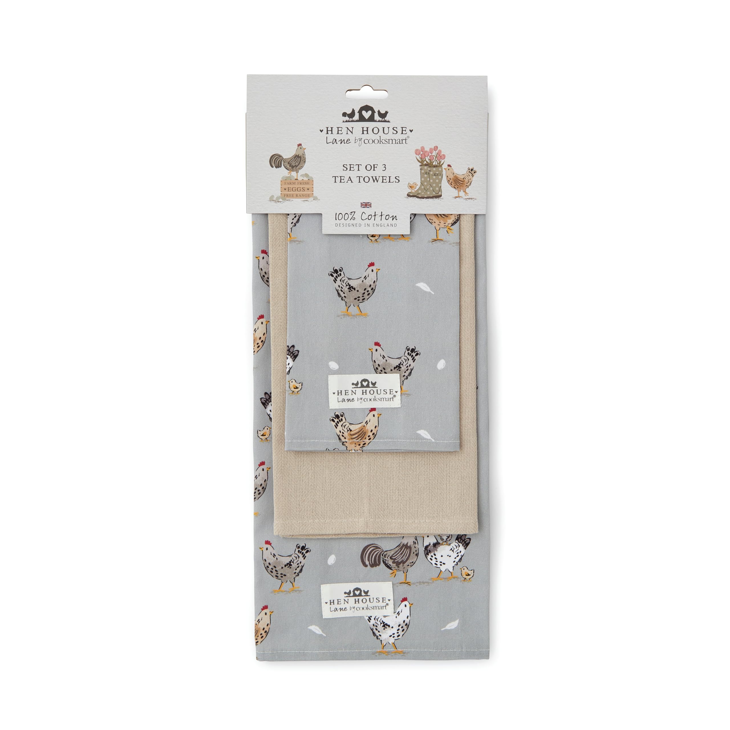 Charmante Geschirrtücher für deine Küche! Dieses 3er-Set von Cooksmart im Bauernhaus-Design mit niedlichen Hühnern, Hähnen und Eiern auf salbeigrauem Hintergrund bringt ländlichen Charme in dein Zuhause. Aus 100% Baumwoll-Twill gefertigt, sind sie super saugfähig und trocknen Geschirr im Nu. Weich, langlebig und perfekt für den täglichen Gebrauch. Maschinenwaschbar bei 30°C - praktisch und pflegeleicht. Ob zum Abtrocknen, als Topflappen oder einfach als Deko - diese Tücher machen in jeder Küche eine gute Figur. Deine Küche, dein Charme - mit diesen stylischen Geschirrtüchern!