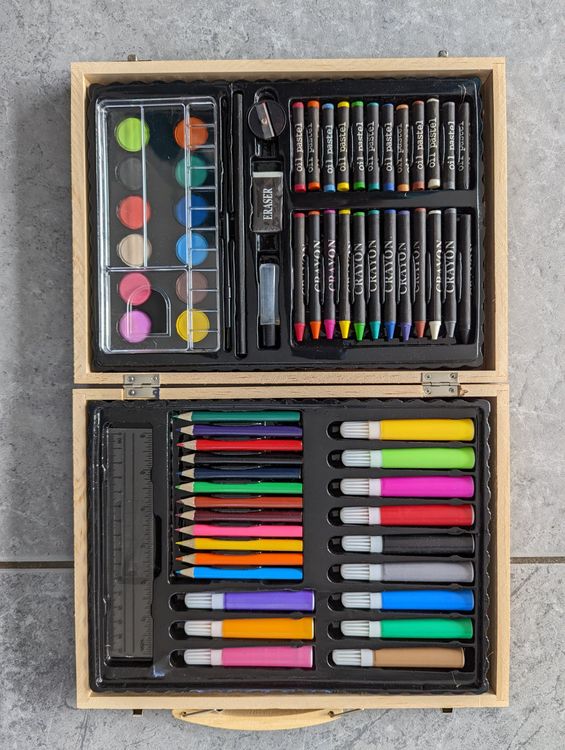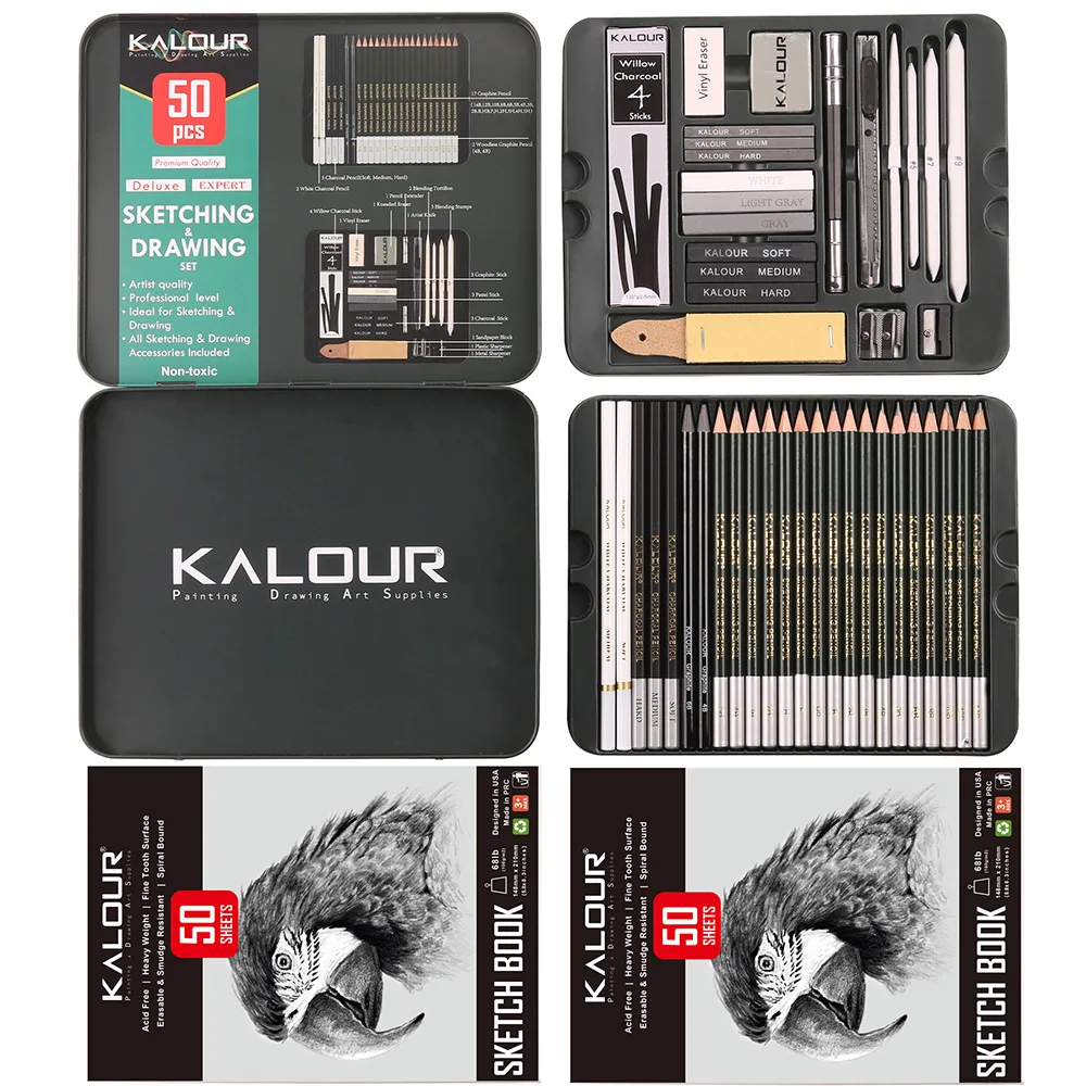 Wow! Dieses KALOUR Skizzen-Set hat alles was Künstlerherzen höher schlagen lässt. 113 Teile in einer praktischen Reißverschluss-Tasche. 24 Skizzenstifte von 6H bis 14B - für jede Schattierung. Inklusive Kohlestifte, Pastellstifte und Mischwerkzeuge. Plus 3-Farben-Skizzenbuch mit 50 Seiten (weiß, schwarz, braun). Mit Radiergummis, Spitzer und Stifterweiterer. Sogar eine Holzpuppe für Figurenzeichnungen ist dabei. Alles ordentlich verstaut - ideal für unterwegs. Perfekt für Anfänger und Fortgeschrittene. Ob zu Hause oder im Freien - immer bereit für kreative Momente. Macht das Zeichnen zum puren Vergnügen! Auch super als Geschenk für kunstbegeisterte Menschen. Hol dir dieses Komplett-Set und starte durch!